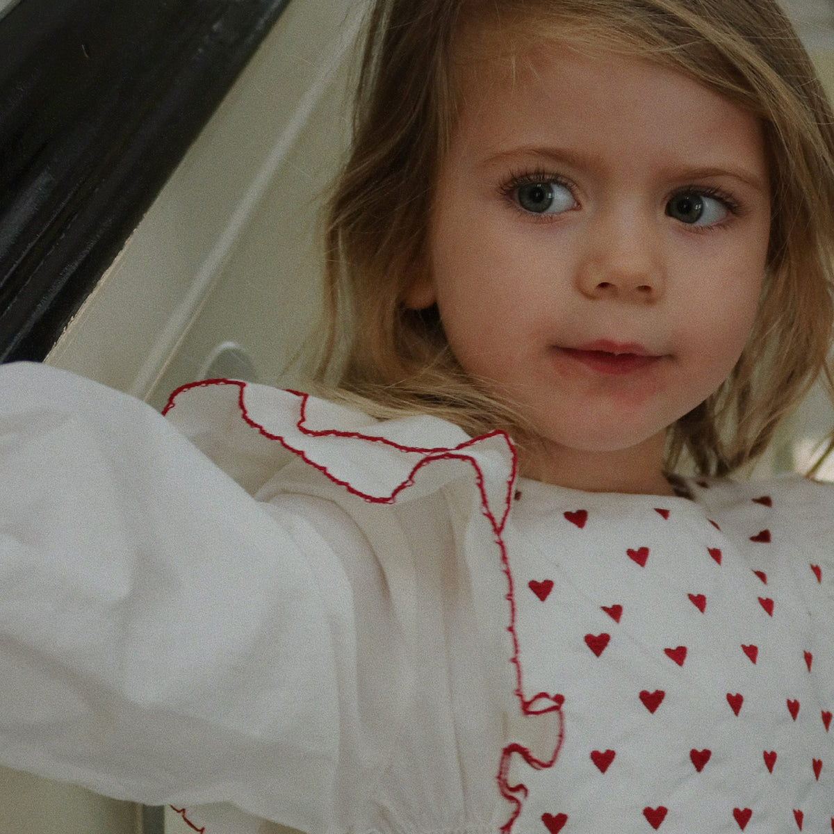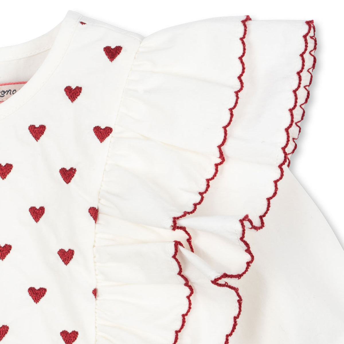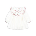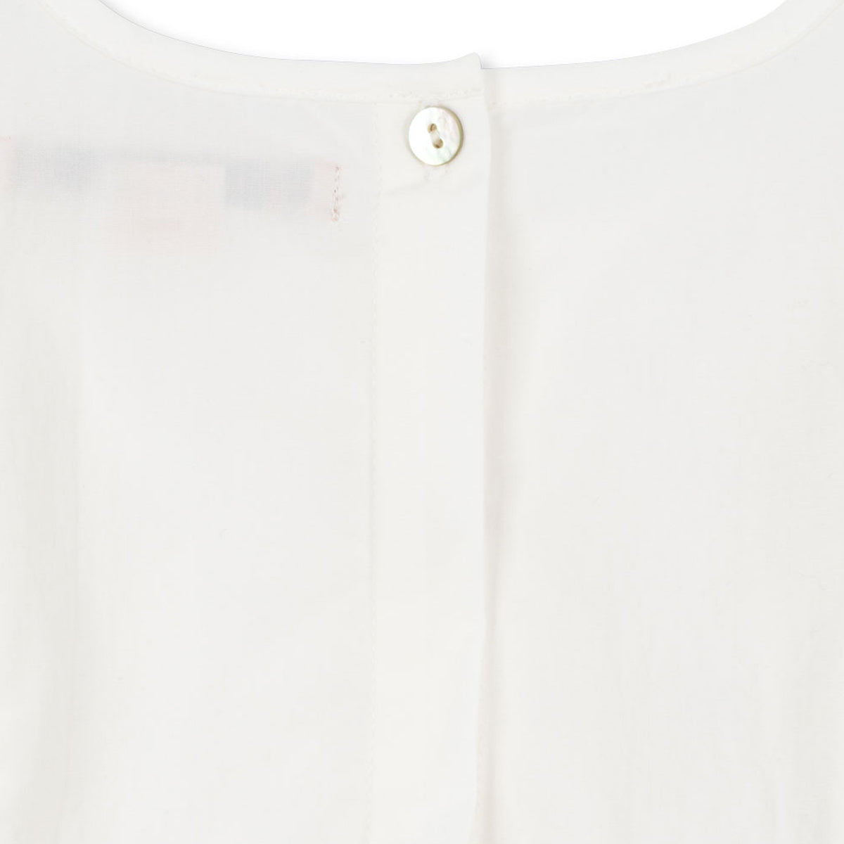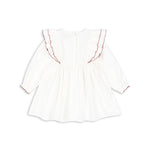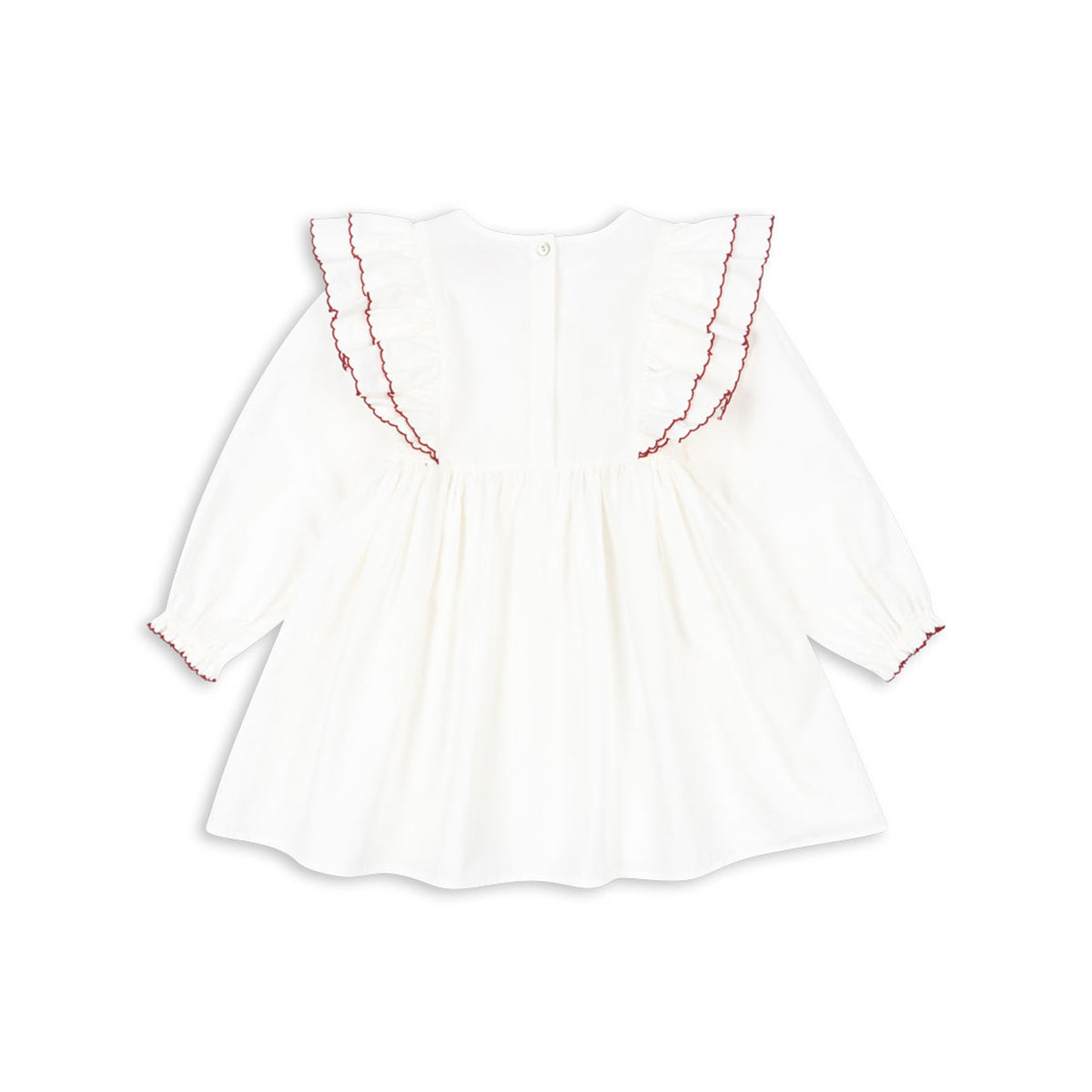 Pamučna haljina sa volančićima na ramenima i širokom suknjom. Kopča se pozadi, ima dugmiće. Napravljena od 100% organskog pamuka (GOTS sertifikat, Organic), sertifikovano od strane CU 1094701.