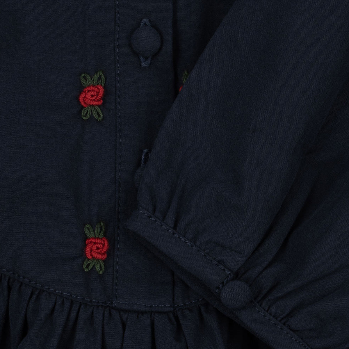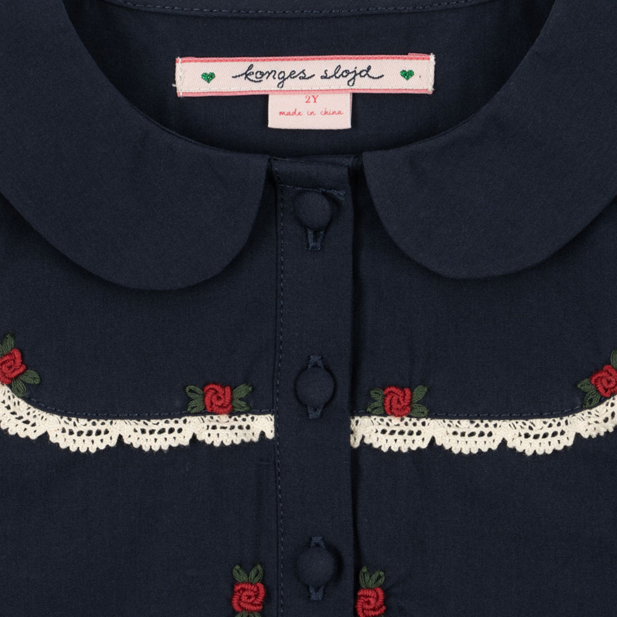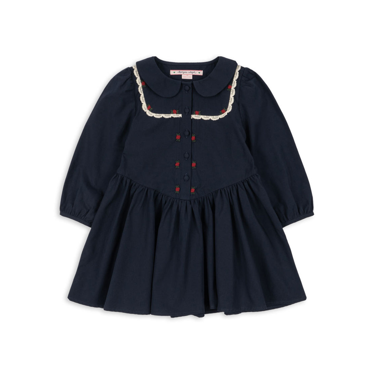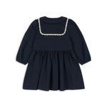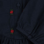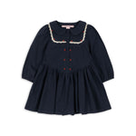 Tkana pamučna haljina sa prelepim detaljima. Dizajnirana sa zaobljenim okovratnikom, čipkanim porubom i dugmićima obloženim tkaninom. Emmy haljina ima uske manžetne sa naborima i široku suknju.