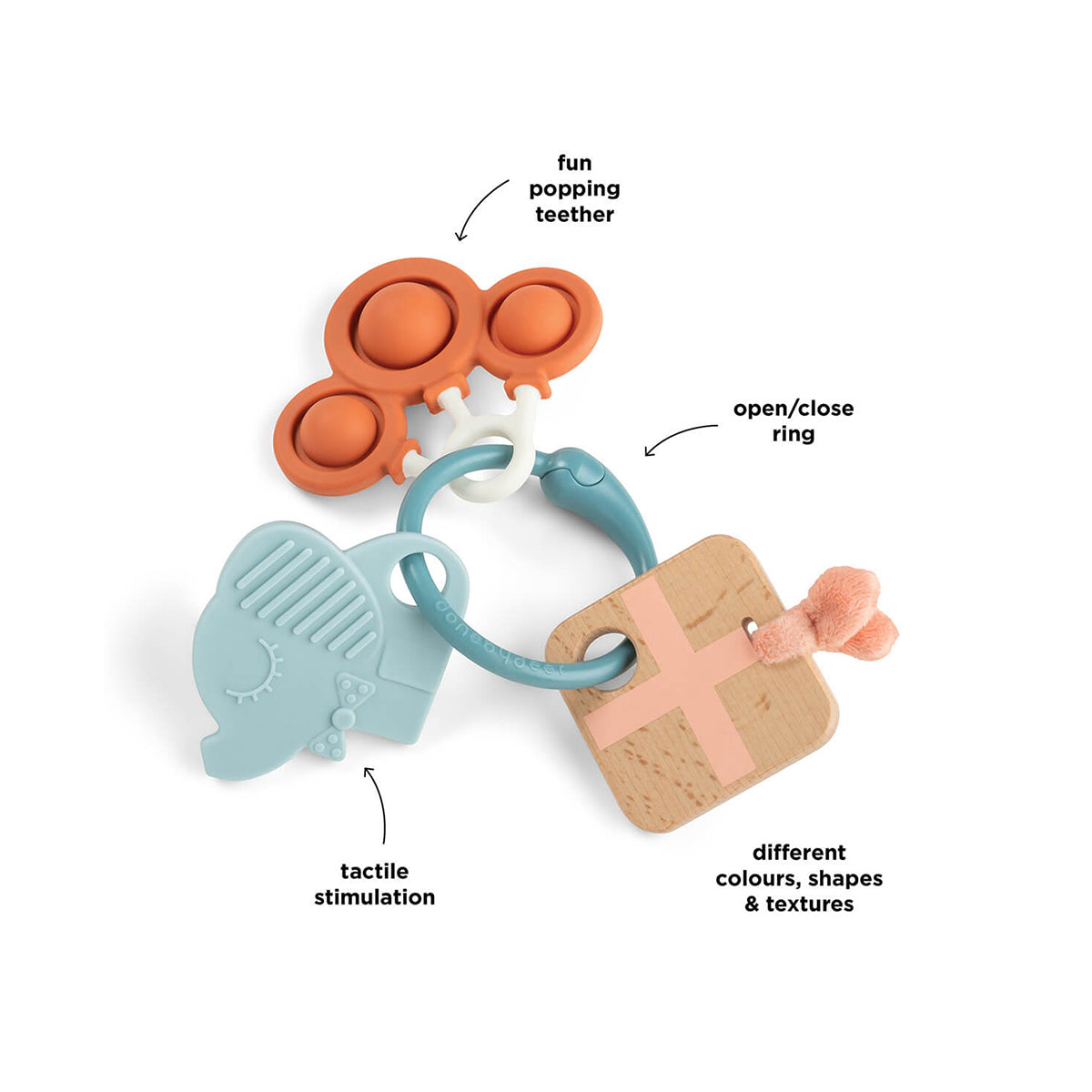 Toliko toga za videti, dodirnuti i otkriti. Ovaj senzorni prsten za igru kombinuje različite teksture, oblike i boje u jednom dizajnu koji je lak za držanje, napravljen za male ruke.