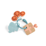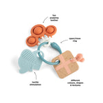 Drvena igračka, poznati Deer prijatelj i mekana silikonska glodalica pozivaju male prstiće da hvataju, tresu i istražuju. Mekani zvuk zvečke se čuje pri svakom trešenju, dok različite površine nude nešto za žvakanje, pomažući da se umire osetljive desni tokom nicanja zuba.