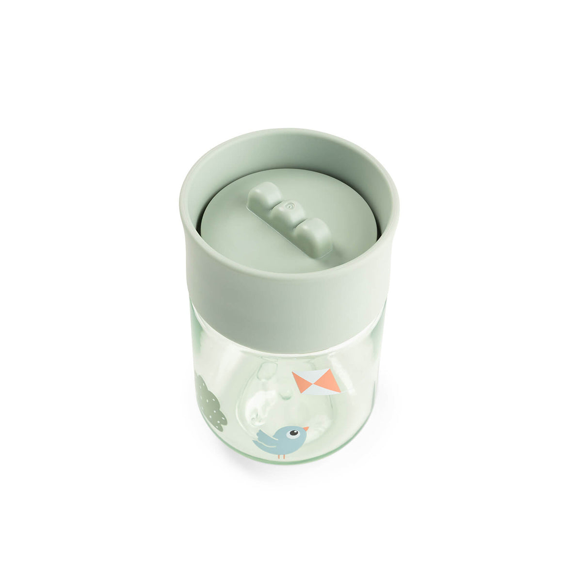 Poklopac koji se okreće omogućava kontrolu protoka tečnosti, tako da napitak ne izlazi odjednom, već se lako prilagođava tempu vašeg mališana i sprečava iznenadna prosipanja. Kada je poklopac zatvoren, čaša ne propušta tečnost, što je čini idealnom za svakodnevne avanture – kod kuće ili u pokretu.