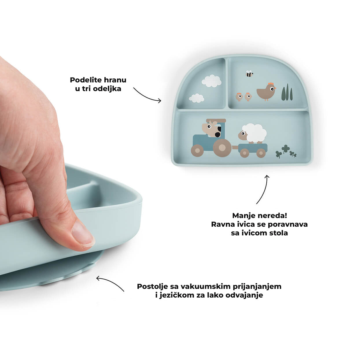 Done By Deer tiny farm silikonski stcik&stay tanjir sa pregradama, plavo