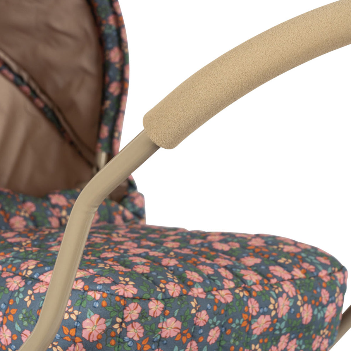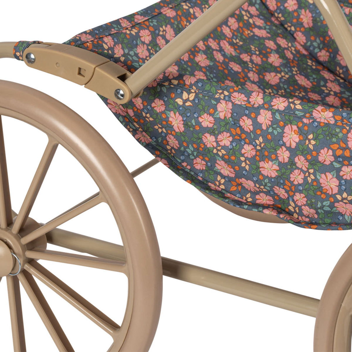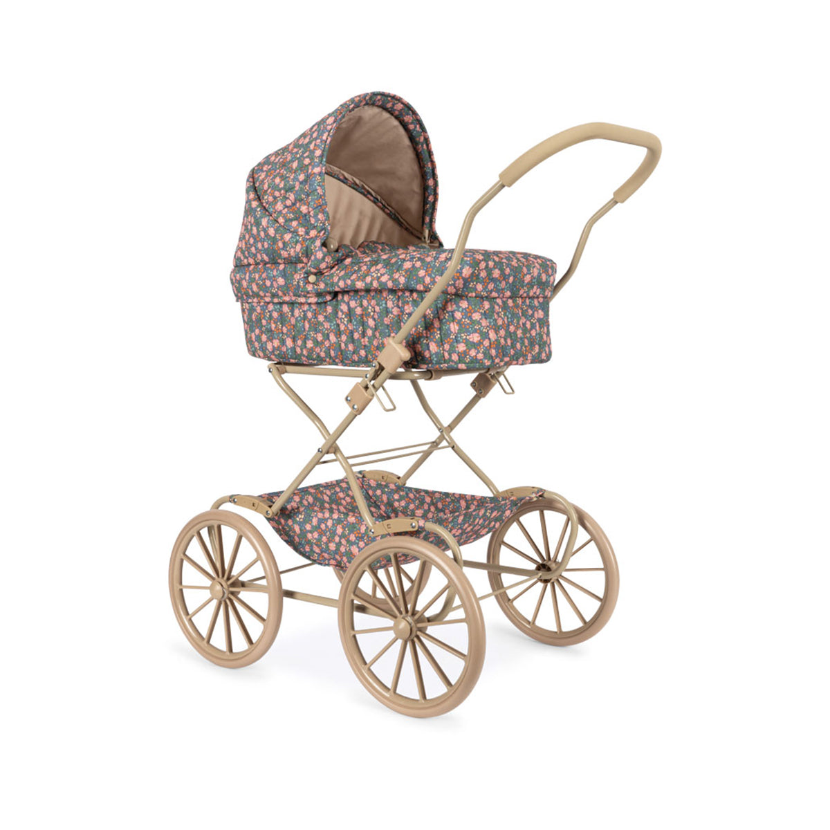 Pravi Konges Sløjd original: Kolica za lutke u vintage stilu, dizajnirana sa četiri velika točka, mekim prošivenim pamučnim platnom, nežnim talasastim ivicama i dušekom. Ispod nosiljke nalazi se mekano postavljena korpa za odlaganje. Ram je izrađen od metala, sa mekanim sunđerastim ručkama za lakše držanje. Kolica dolaze potpuno sklopljena i lako se sklapaju i odlažu.