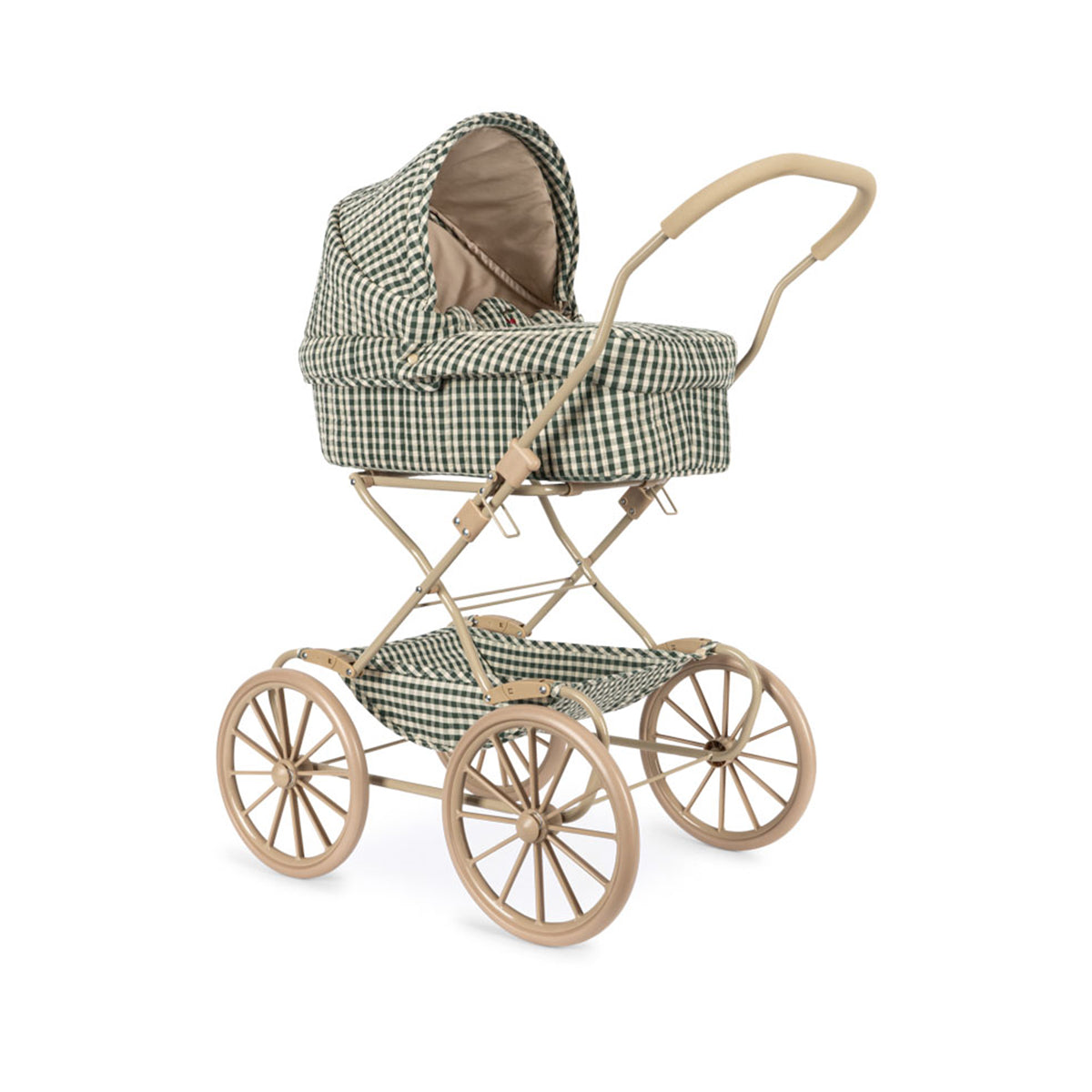 Pravi Konges Sløjd original: Kolica za lutke u vintage stilu, dizajnirana sa četiri velika točka, mekim prošivenim pamučnim platnom, nežnim talasastim ivicama i dušekom. Ispod nosiljke nalazi se mekano postavljena korpa za odlaganje. Ram je izrađen od metala, sa mekanim sunđerastim ručkama za lakše držanje. Kolica dolaze potpuno sklopljena i lako se sklapaju i odlažu.