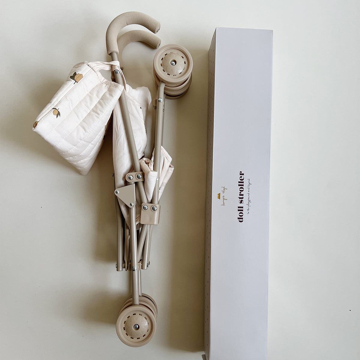 Kolica za lutke sa pojasom, torbom i četiri dupla točka za dodatnu stabilnost. Izrađena od organske pamučne tkanine koja se može ukloniti. Dolaze u potpunosti sastavljena. Lako se sklapaju i čuvaju. Okvir je napravljen od gvožđa sa mekim i sunđerastim EVA materijalom na ručkama.