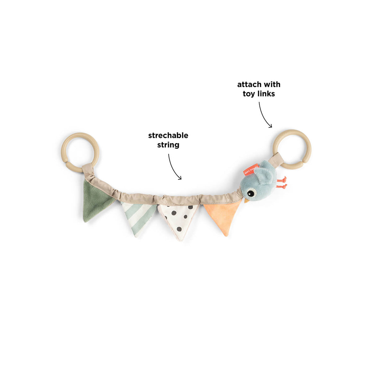 Lako se pričvršćuje na kolica, dečija sedišta ili aktivne centre, što je čini jednostavnom za nošenje gde god dan vodi. Razigrane boje, printovi i nežni pokreti stimulišu čula i podstiču male oči da prate, fokusiraju se i istražuju.