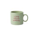 Šolja je svetlo zelene boje a natpis "I LOVE YOU MATCHA" roze boje.