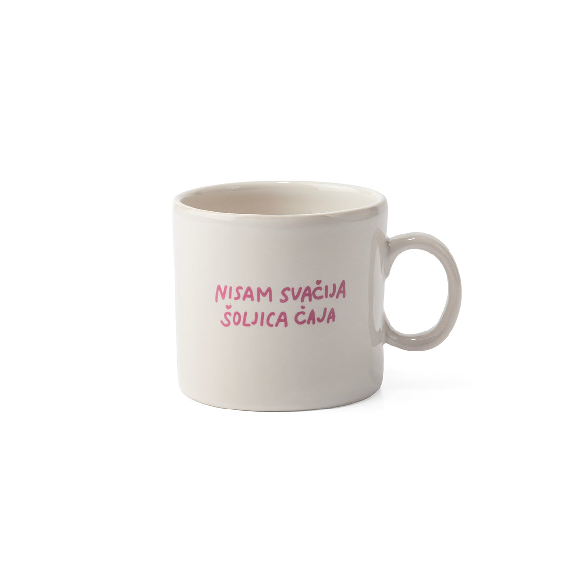 Šolja je bele boje a natpis "Nisam svačija šoljica čaja" roze boje.
