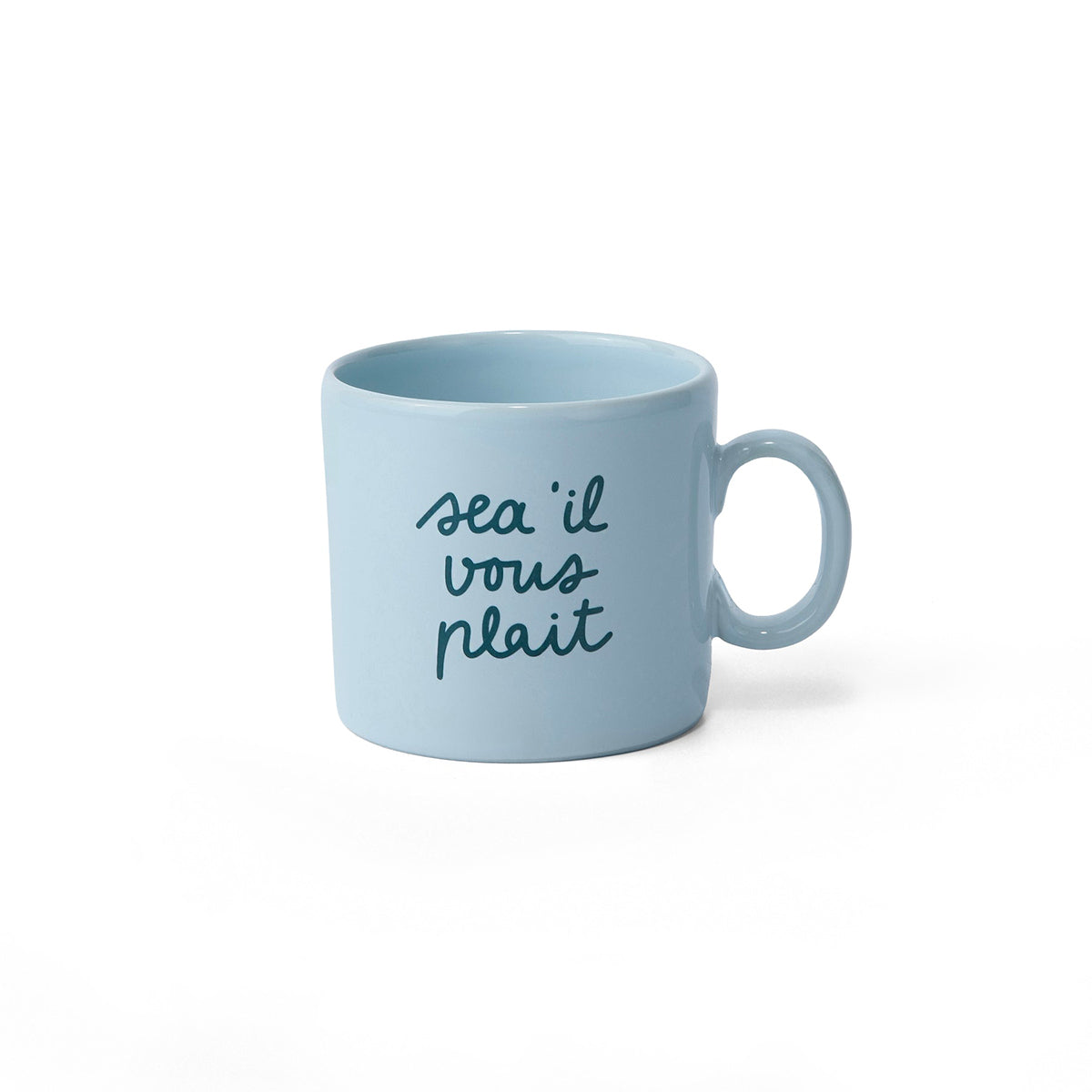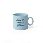 Šolja je svetlo plave boje a natpis "SEA IL VOUS PLAIT" tamno plave.
