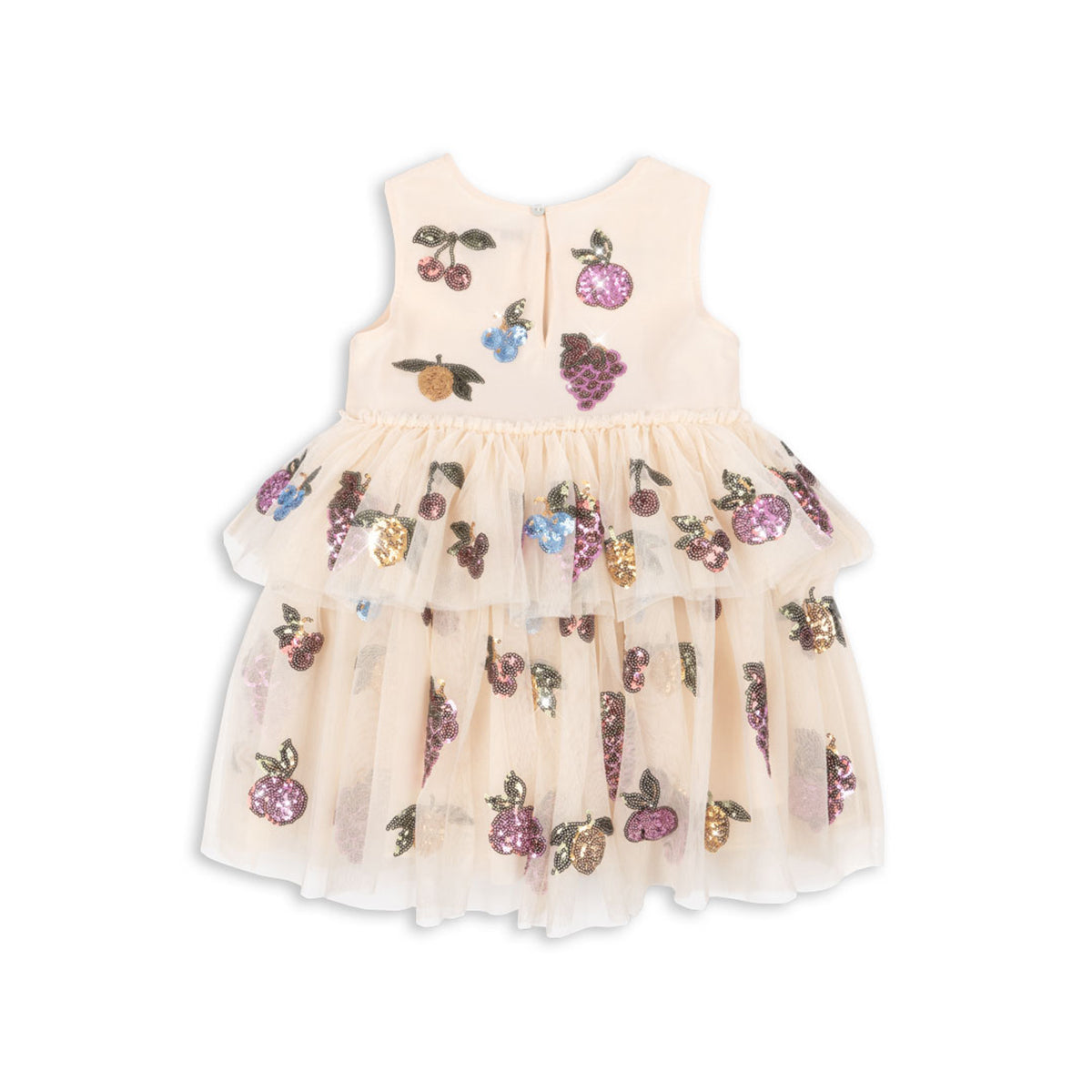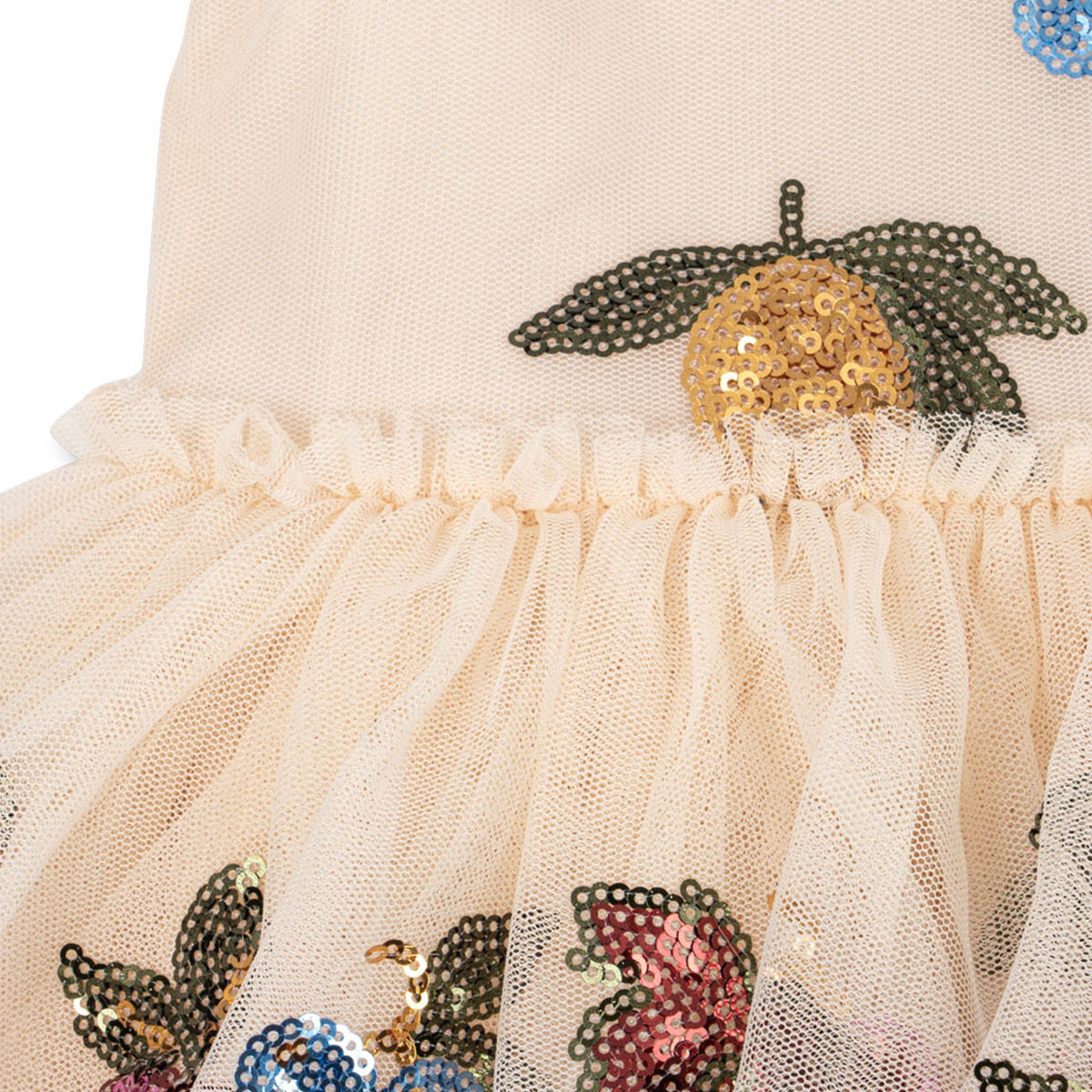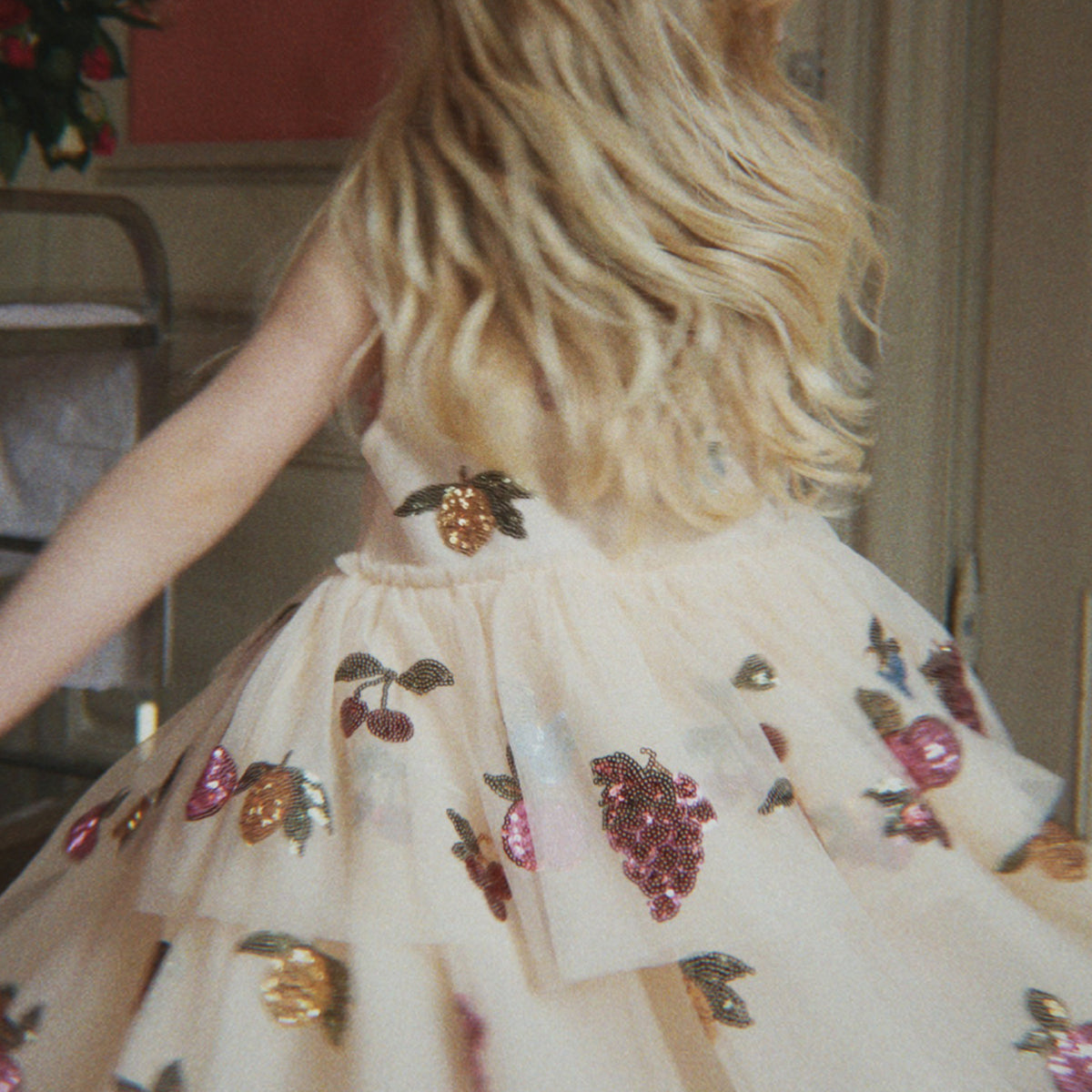 Unesi malo magije uz Konges Slojd Yvonne haljinu. Ovaj svetlucavi komad krasi slojevita suknja od tila savršena za okretanje i igru, dok je unutrašnjost postavljena mekim pamukom za udobnost i prijatno nošenje.