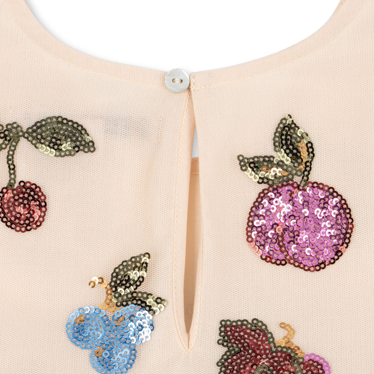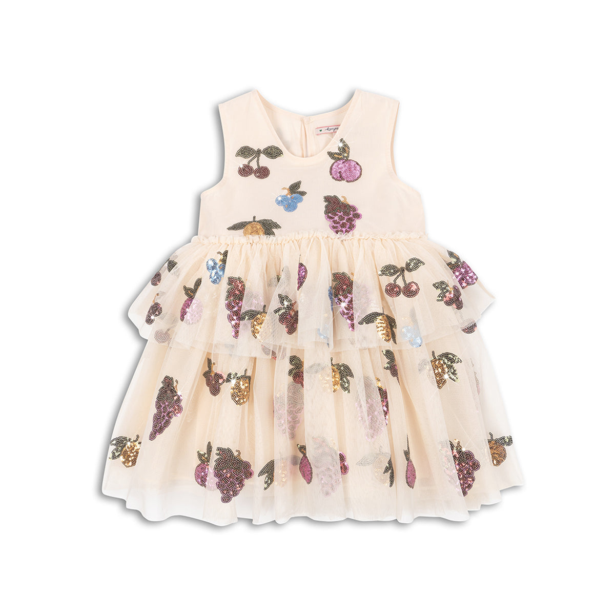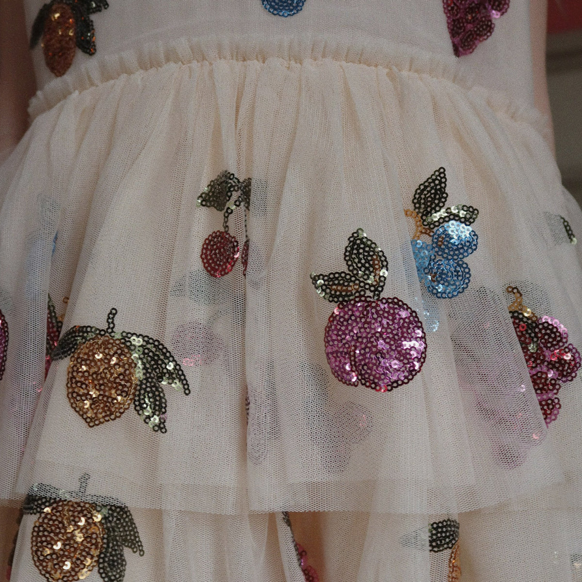 Unesi malo magije uz Konges Slojd Yvonne haljinu. Ovaj svetlucavi komad krasi slojevita suknja od tila savršena za okretanje i igru, dok je unutrašnjost postavljena mekim pamukom za udobnost i prijatno nošenje.