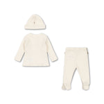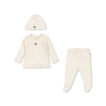 Savršen poklon za nove roditelje: pažljivo osmišljen set za bebe koji sadrži mekanu majicu na preklop, helankice sa stopicama i kapicu.