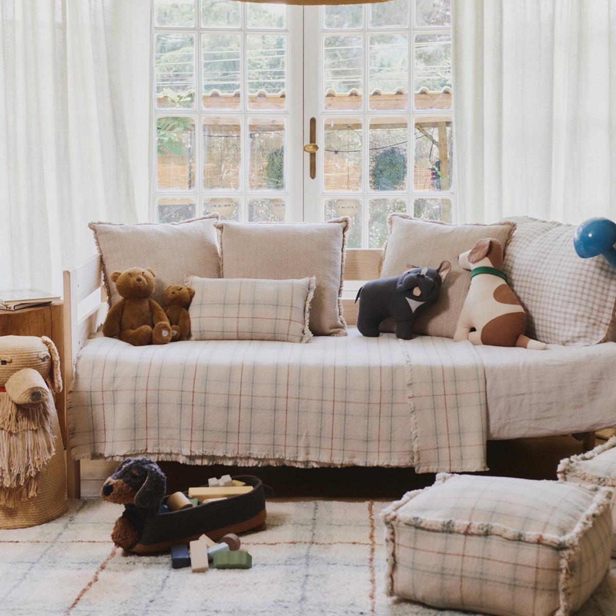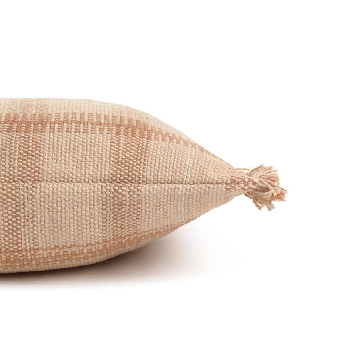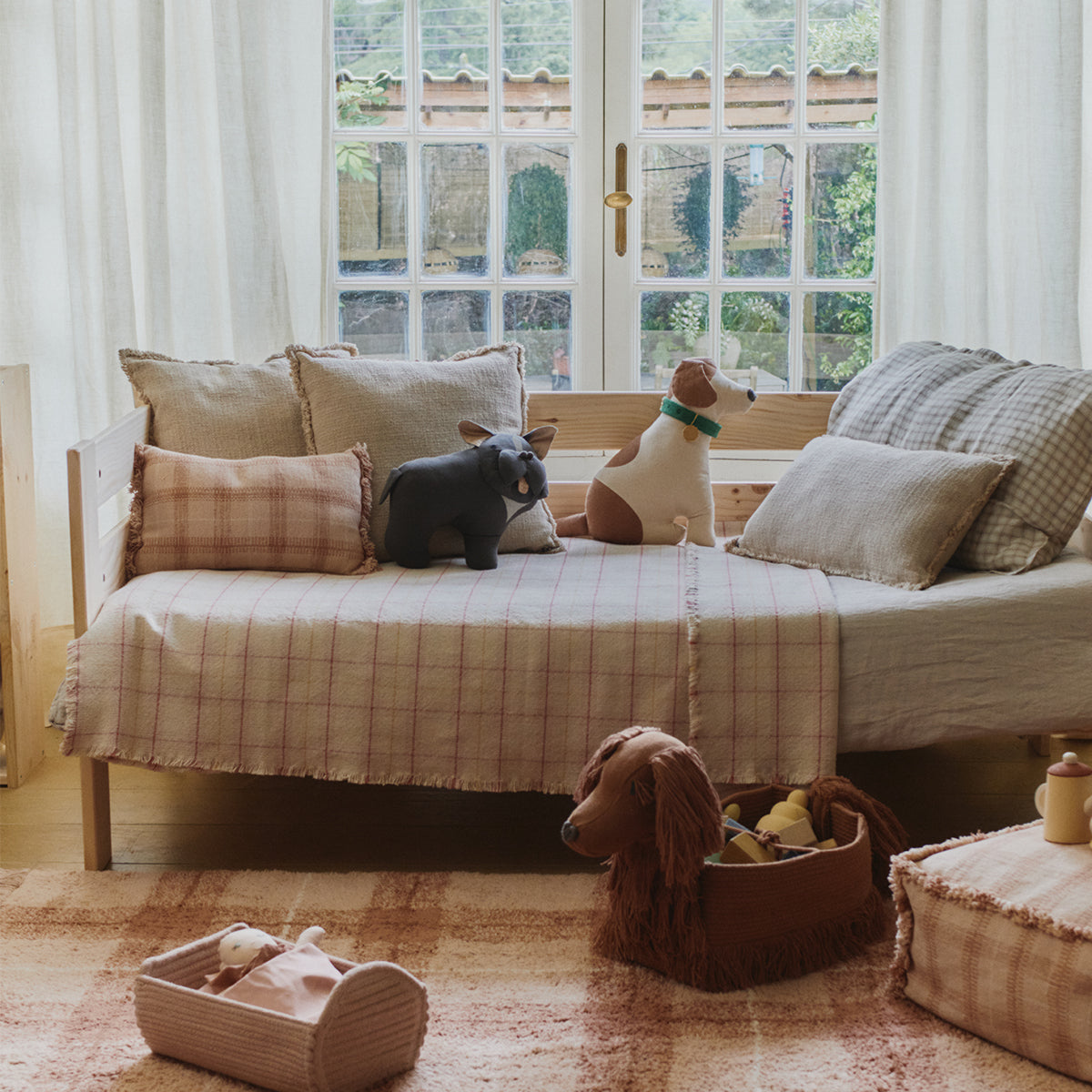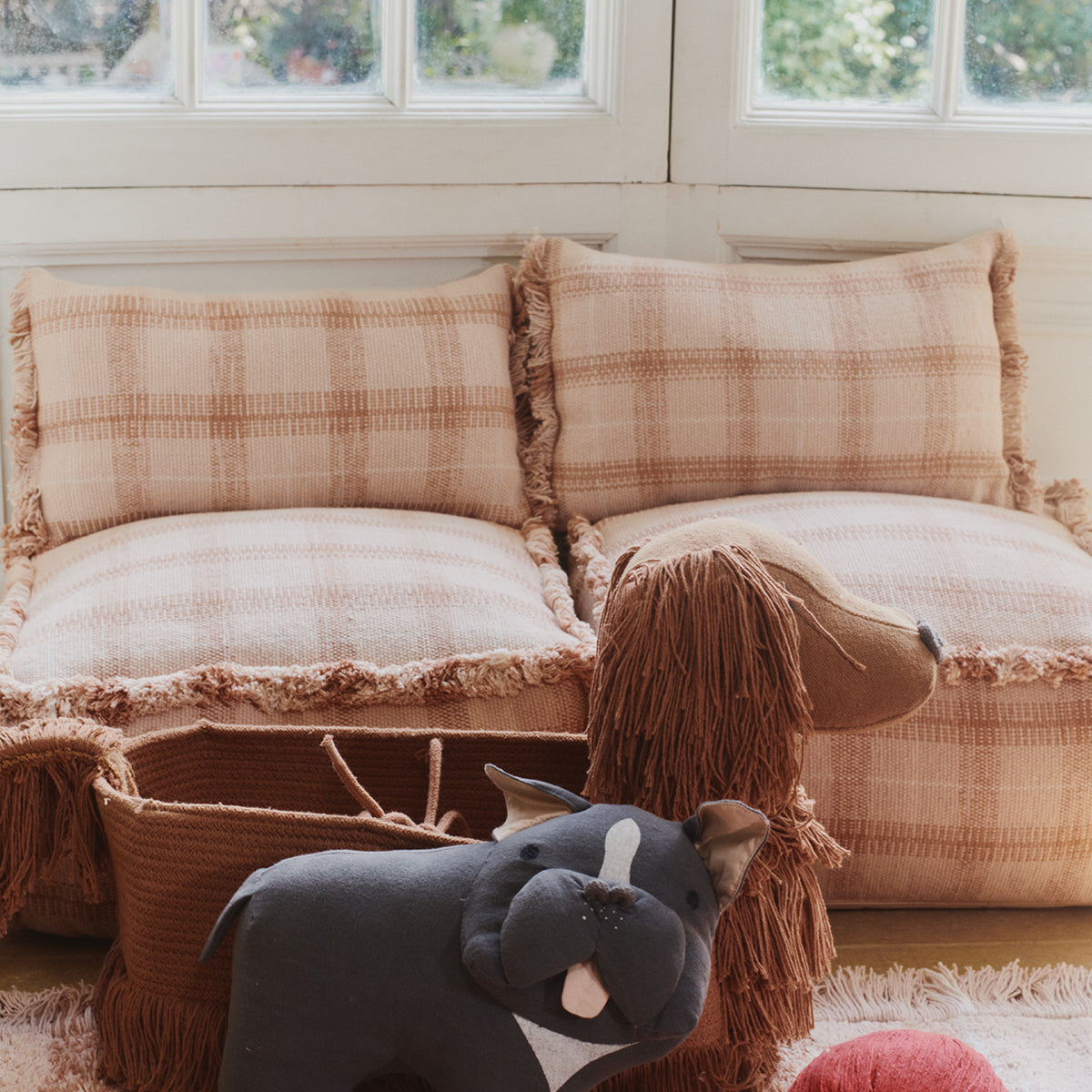 Udoban mali jastučić sa britanskim šarmom! Ručno tkan na tradicionalnim razbojima i izrađen u tonovima ruže i kestena. Njegove rese dodaju razigran dodir, savršen za uređenje sobe vašeg mališana.