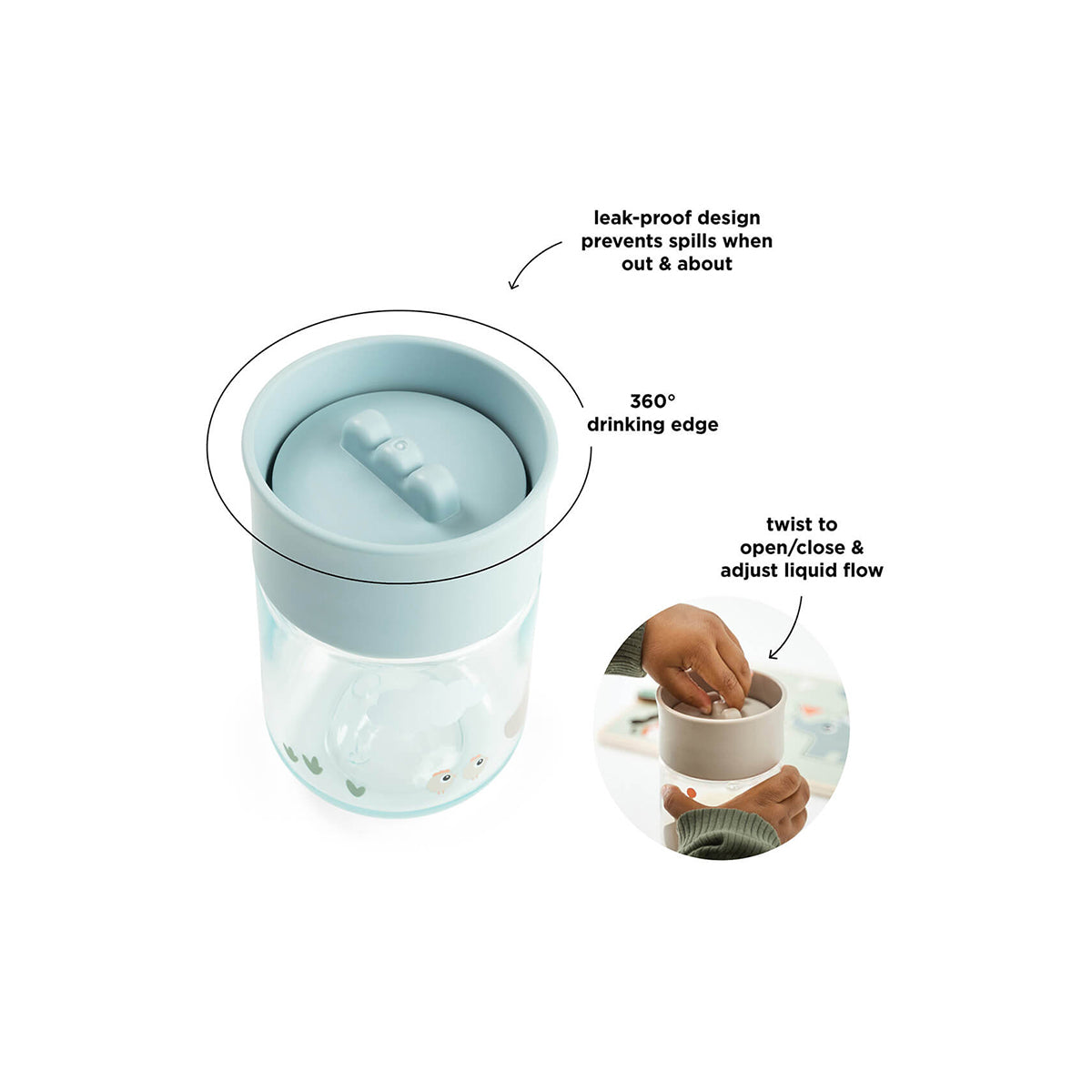 The twistable lid allows you to control the flow of liquid, so it doesn’t come out all at once. It easily adapts to your little one’s pace and helps prevent unexpected spills. When the lid is closed, the cup is leak-proof, making it ideal for everyday adventures – whether at home or on the go.