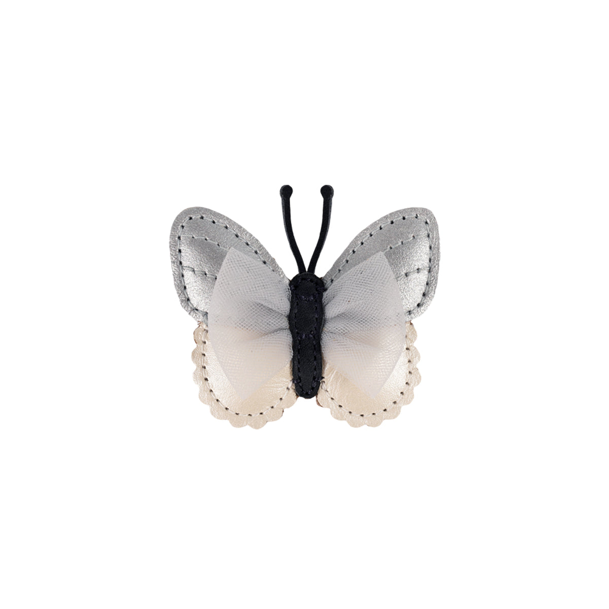 Fly, my little darling! The adorable Alja Clip is an excellent accessory to add the perfect finishing touch to your little one's summer outfit. Whether you fasten it in their hair or clip it to their jacket or blouse, this charming accessory, designed in the shape of a little butterfly, features original tulle wing details. Made from 100% premium leather, this delightful clip is sized at 4 cm x 5 cm.