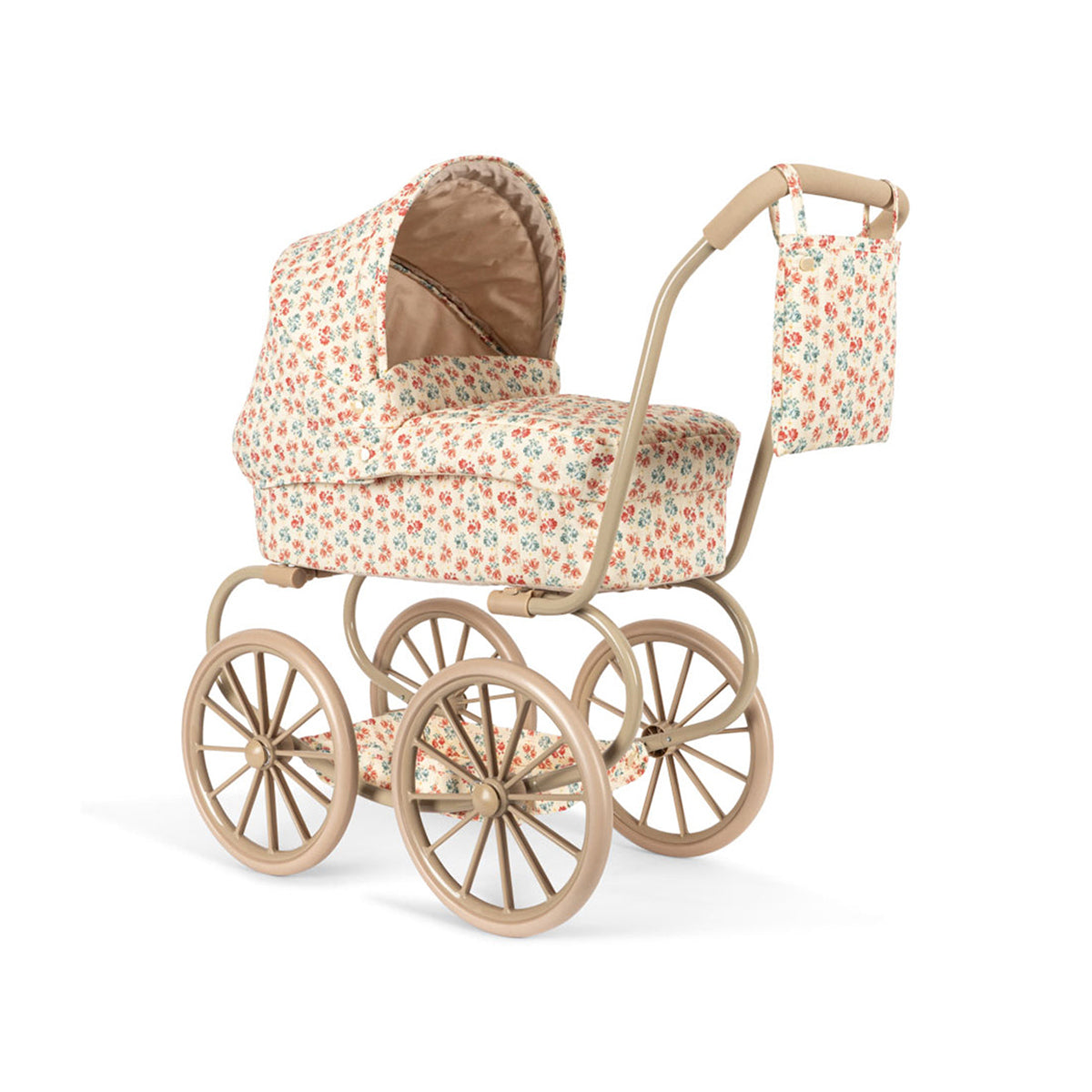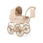 A vintage-style doll stroller in a smaller version, customized for smaller children. Designed with four large wheels, soft quilted cotton canvas, gentle wavy edges and mattress. The doll stroller includes a collapsible sun canopy and a storage basket. The frame is made of metal with spongy soft grips. They come fully assembled and are easy to store.