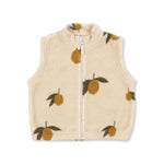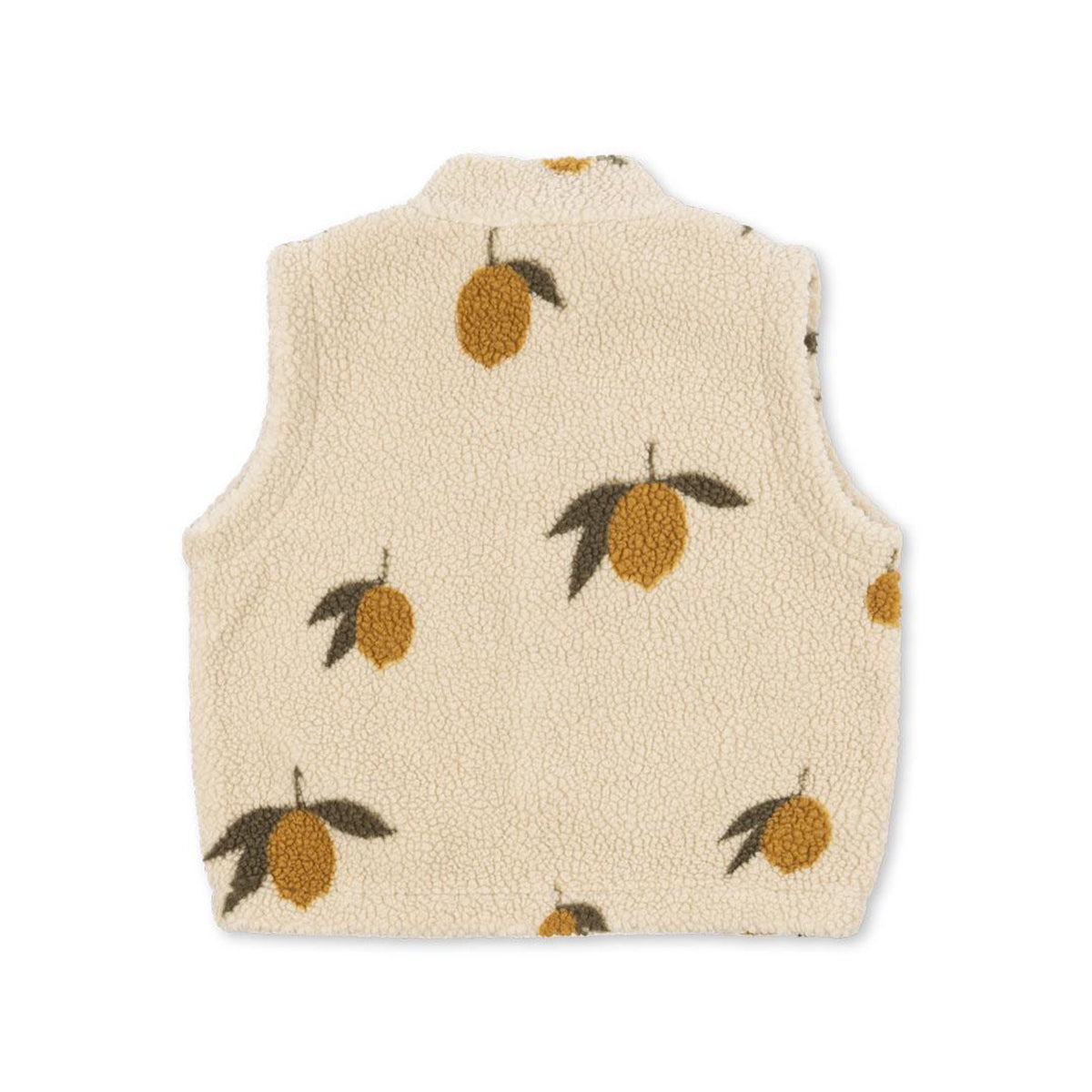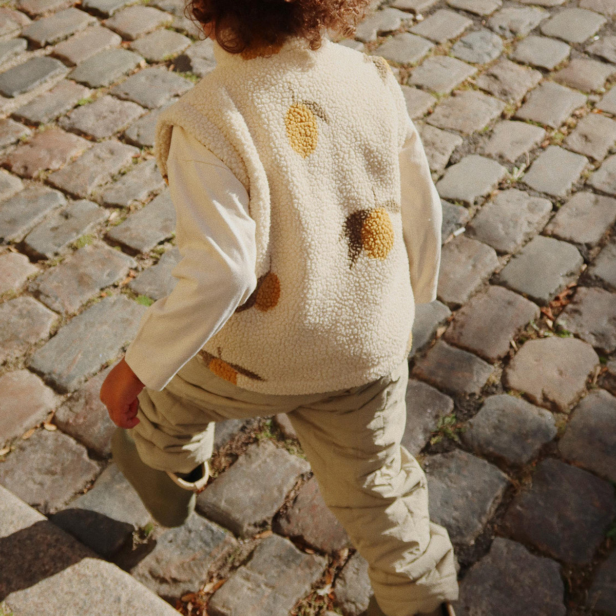 Warm vest made of teddy fleece with a soft inner fleece lining. Features a high collar and an elastic bottom hem for a comfortable fit. Equipped with a sturdy zipper that's easy for little hands to use.