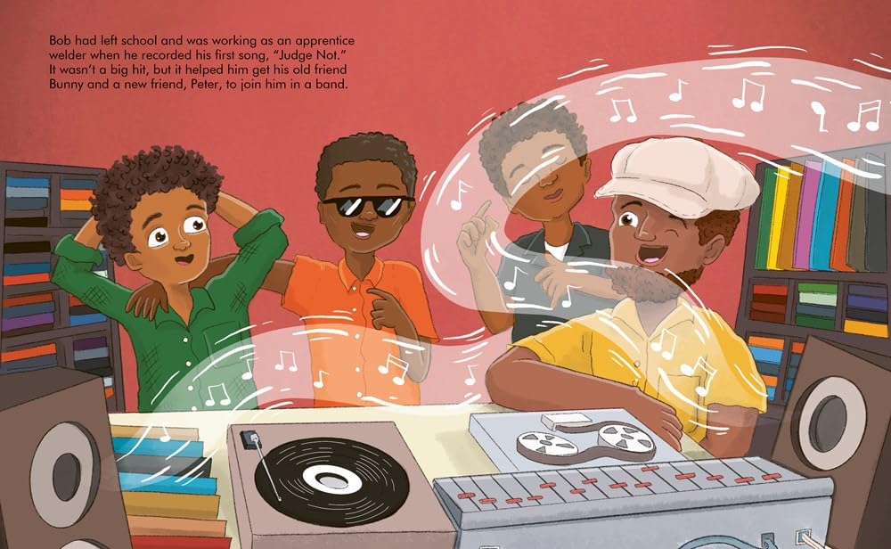Little Bob grew up on the sunny, Caribbean Island of Jamaica. Born to a Black mother and white father, life could be difficult, and he was often bullied for the colour of his skin. But Bob didn't let others' unkindness harden his heart, instead he dreamed of a world where everyone felt they belonged. At twelve years old, he moved to Kingston and fell in love with ska—a style of popular music indigenous to Jamaica. Over the next few years he wrote songs, took singing lessons and played as much as he could with his newly formed band, Bob Marley and the Wailers. A year after their first hit single, Bob was introduced to Rastafari, a Jamaican religion and political movement. Driven to spread Rastafari beliefs, Bob and his band began to create Reggae, using their lyrics and melodies to fight for social justice and advocate for peace. Before long, his songs were spreading a message of unity across the world . . .