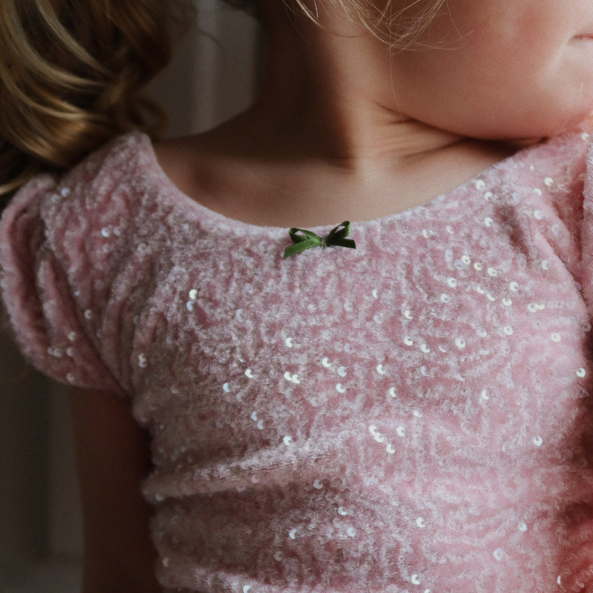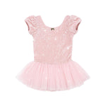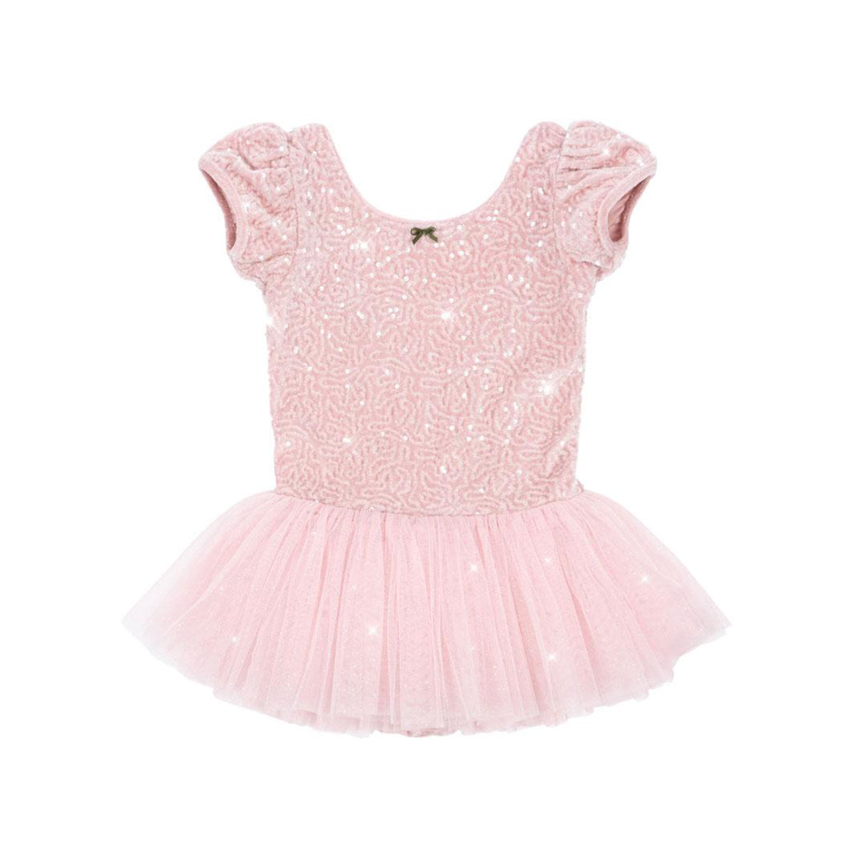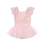 Classic tutu dress for little ballerinas featuring a low scoop back and puff sleeves. Designed with a voluminous tulle skirt attached to a fitted leotard made from stretchy performance fabric with decorative sequins.