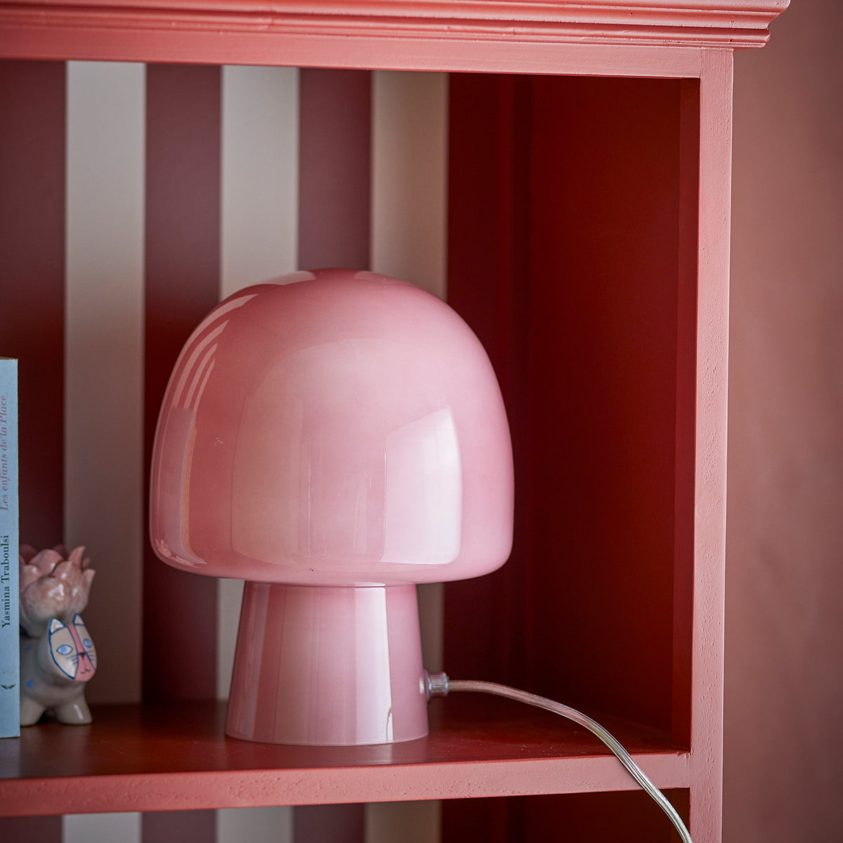 Paddy stona lampa brenda Bloomingville izrađena je od roze stakla u šarmantnom obliku pečurke i unosi eleganciju i karakter u svaki prostor. Kada se uključi, njena nežna roze nijansa prelazi u suptilnu blush boju, otkrivajući prelepu teksturu koja stvara blagu i prijatnu igru svetlosti u prostoriji.