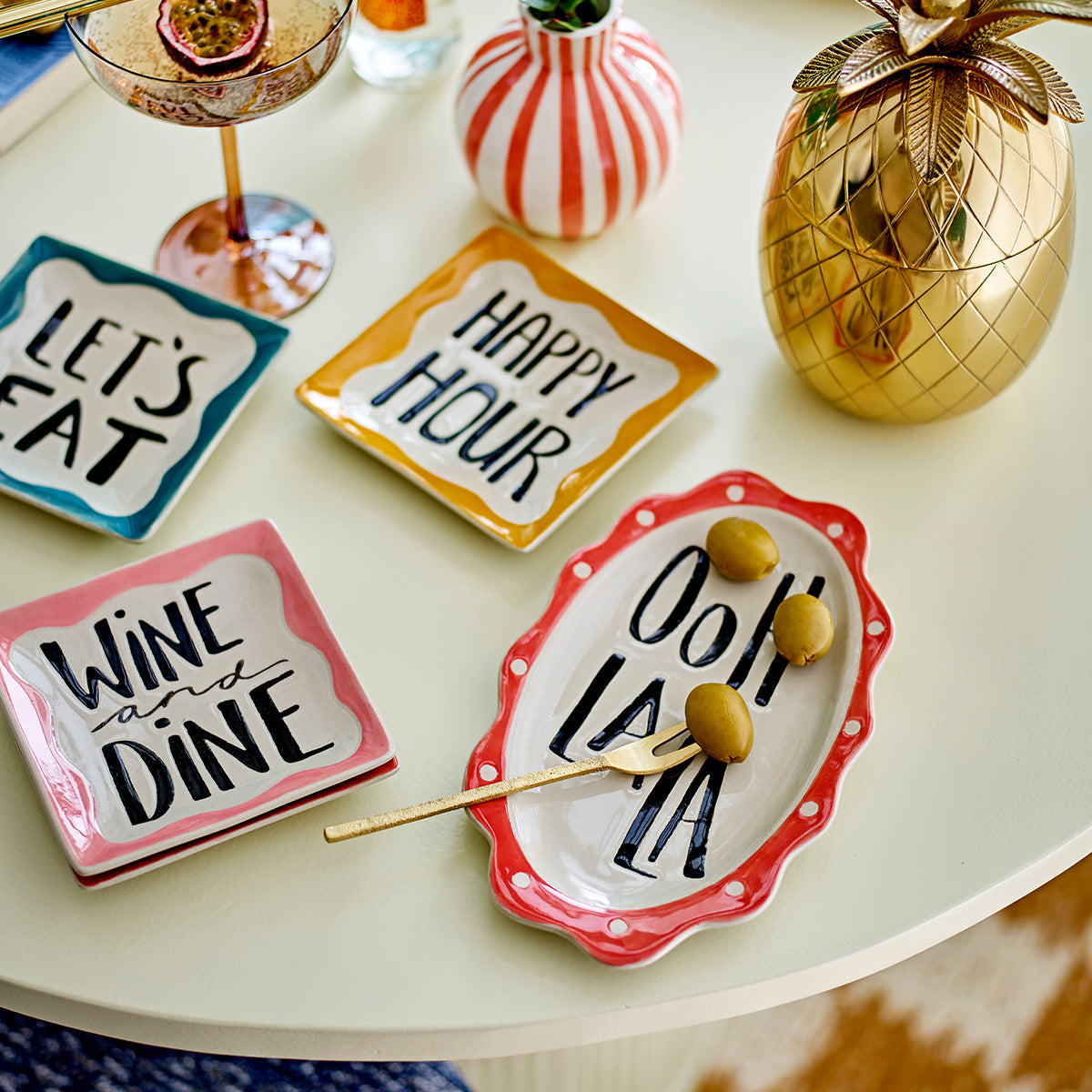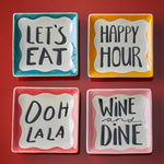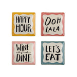 Soline tanjiri brenda Bloomingville dolaze u setu od četiri kvadratna tanjira od stoneware keramike. Svaki tanjir ima centralni krem deo sa ručno ispisanom frazom. Završeni u toplim, smirenim tonovima, sa ručno oslikanom površinom koja donosi blage varijacije u šari i intenzitetu boje.