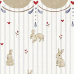 Zečići na prugama koje podsećaju na teksturu tkanine — poput debljeg pamuka ili lana. Zečići su u pastelnim tonovima, a između njih su zvezdice.