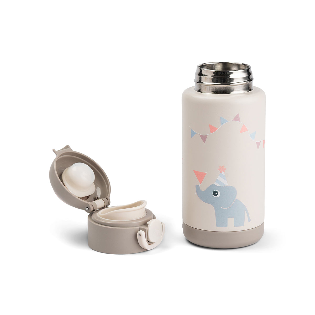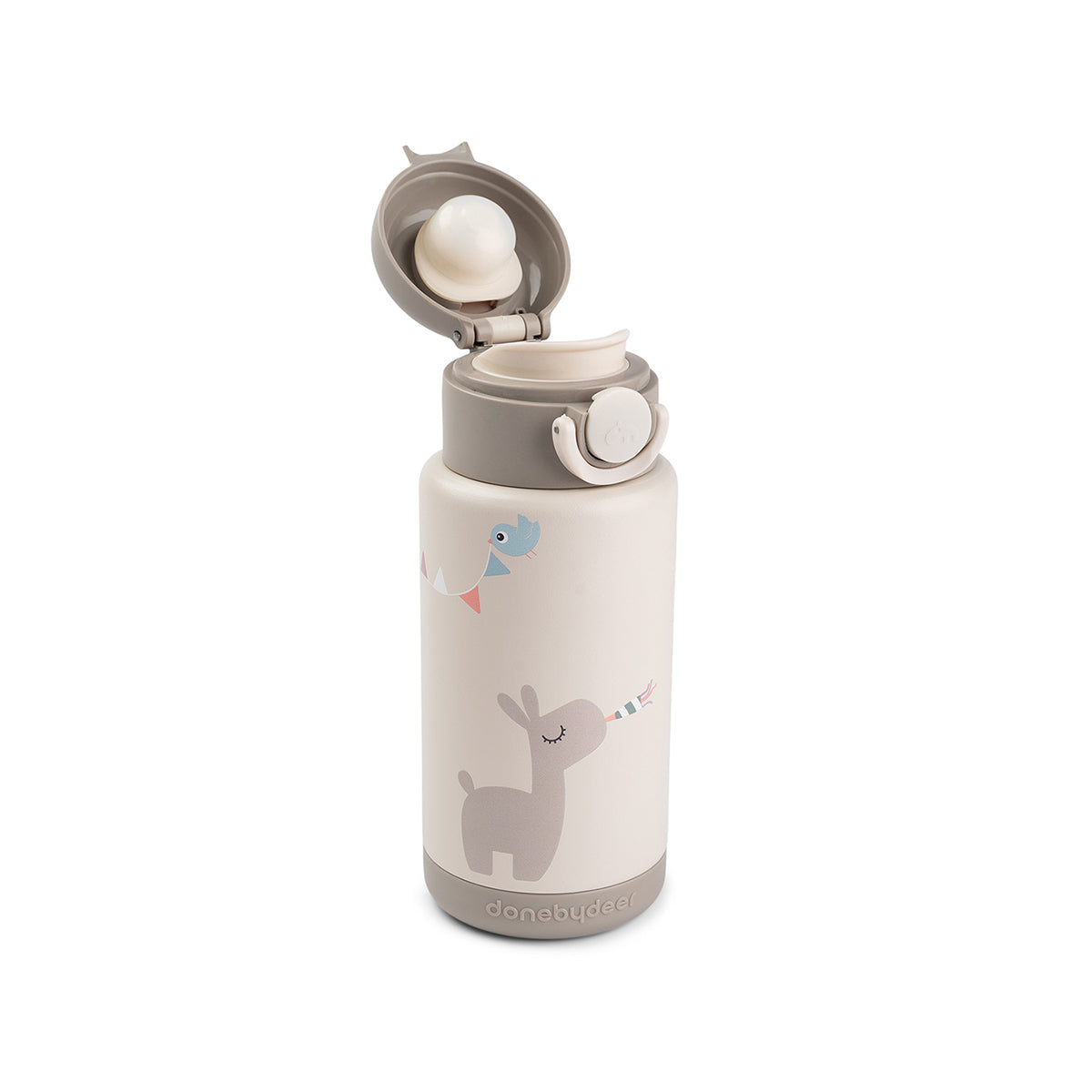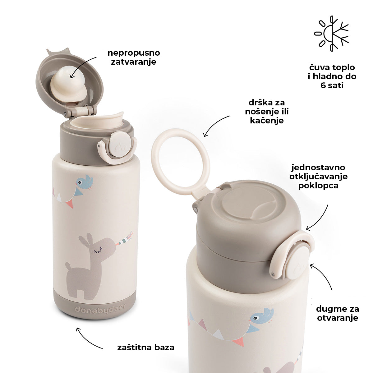 Promišljeni detalji čine je jednostavnom za samostalnu upotrebu: poklopac na dugme prilagođen malim prstima, sigurni silikonski prsten koji sprečava prosipanje u rancu i praktična ručka za nošenje kada ste u pokretu. Boca održava napitke toplim ili hladnim – baš kako tvoj mališan voli – i to do šest sati van kuće. Sa kapacitetom od 340 ml, savršene je veličine da osveženje traje od jutarnje užine do popodnevne igre.
