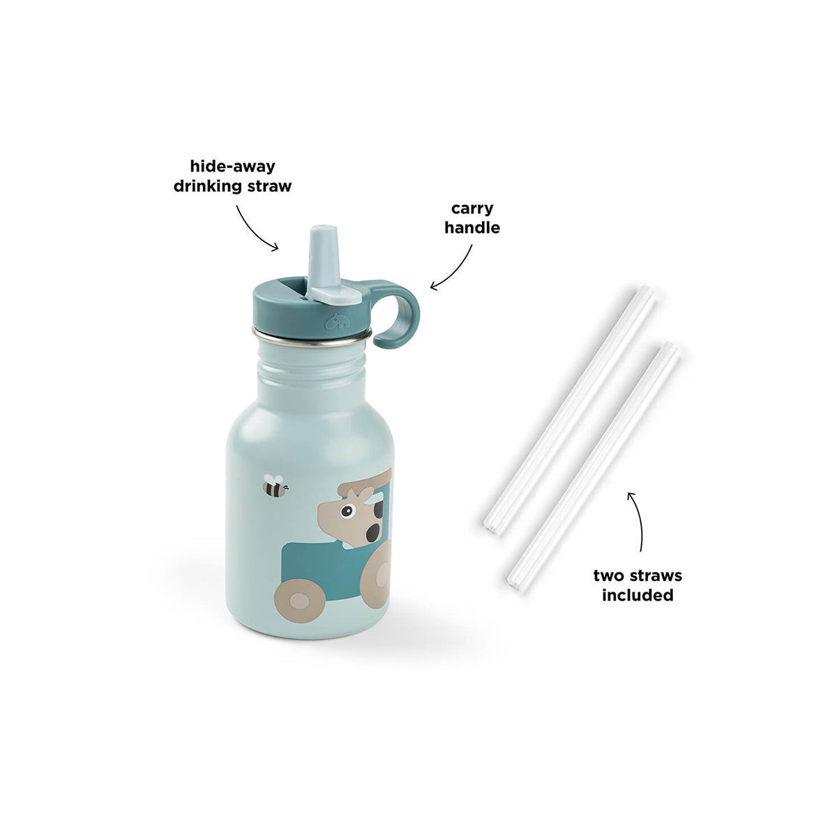 Metalna boca za piće je čvrsta i ima praktičnu slamku za skrivanje. Savršena je za dečji ranac. Dolazi sa dve slamke.