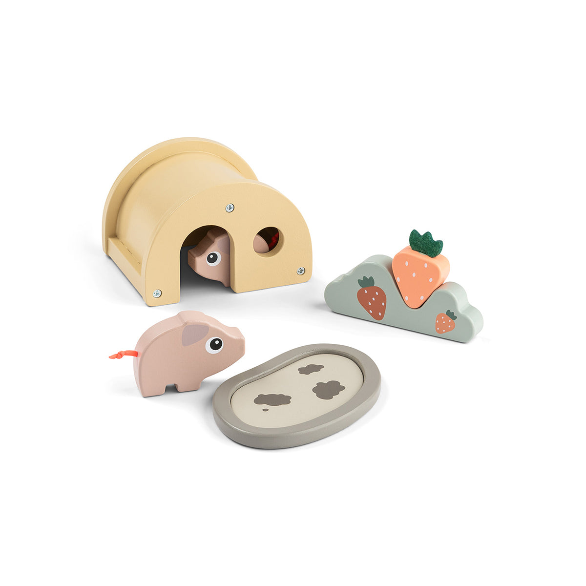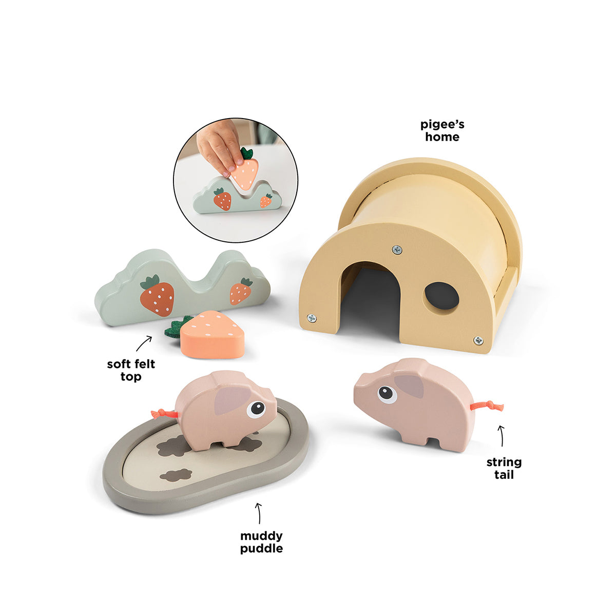 Radoznali umovi i male ruke će obožavati da zakorače u svet male farme sa ovim drvenim kompletom za igru. Dizajniran da probudi maštu, komplet poziva mališane da kreiraju svoje priče o farmi pune srećnog groktanja, blatnjavih avantura i njuškica.