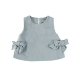 Mašne i osmesi svuda! Veeri top je lagani letnji komad, upotpunjen prepoznatljivim Donsje detaljima. Ima diskretni otvor na leđima sa kopčanjem na dugme i šarmantne mašne, pa je savršen i za igru i za odmor. Bilo da se kombinuje sa Donsje šortsem ili suknjom, nezaobilazan je komad za tople dane.