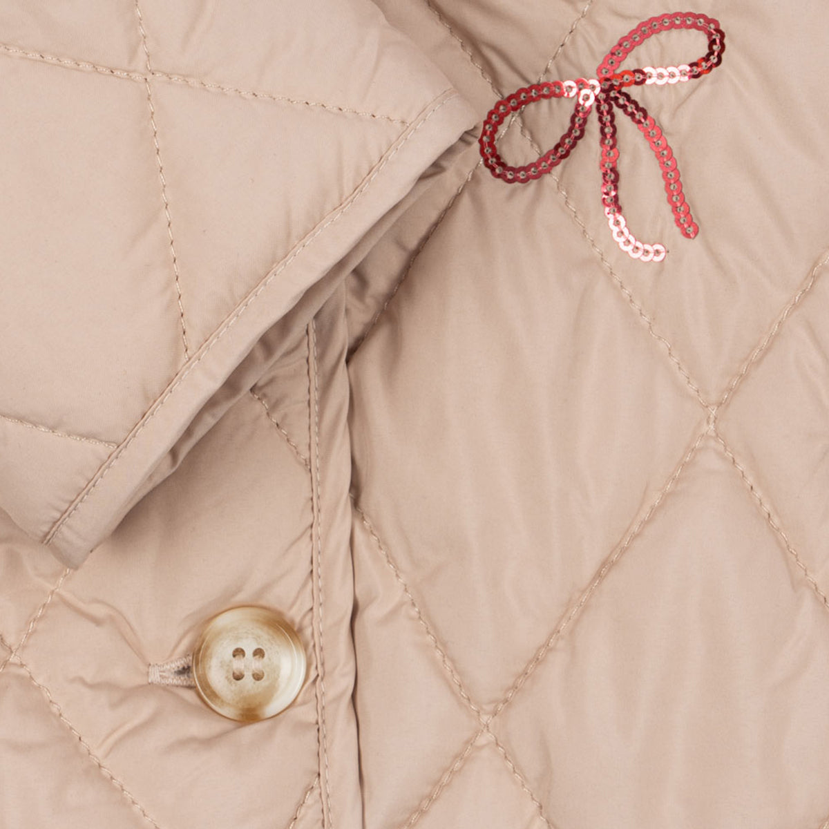 Lagana jakna sa blago postavljenim punjenjem i dekorativnim šljokicama. Dizajnirana u ležernom kroju koji treba da bude malo širi, sa klasičnim okruglim izrezom i uskim manžetnama kao slatkim završnim detaljima.
