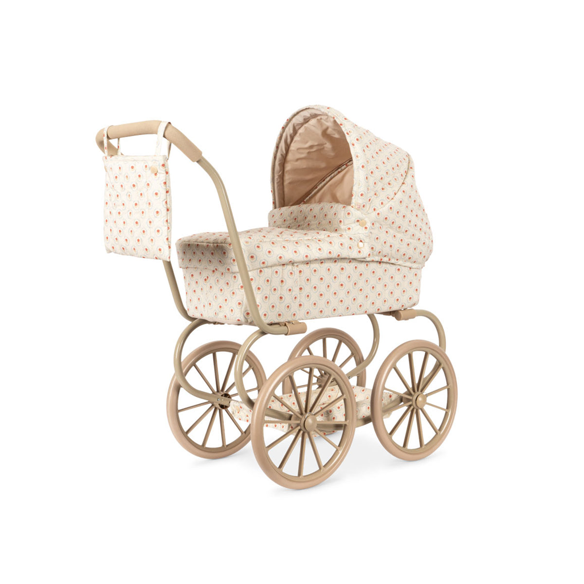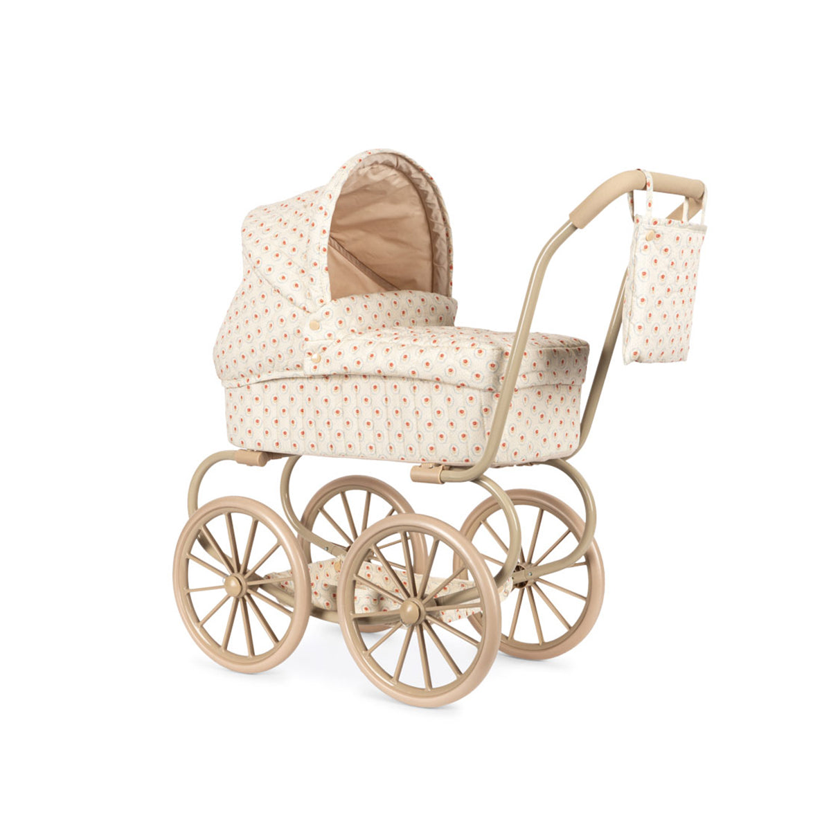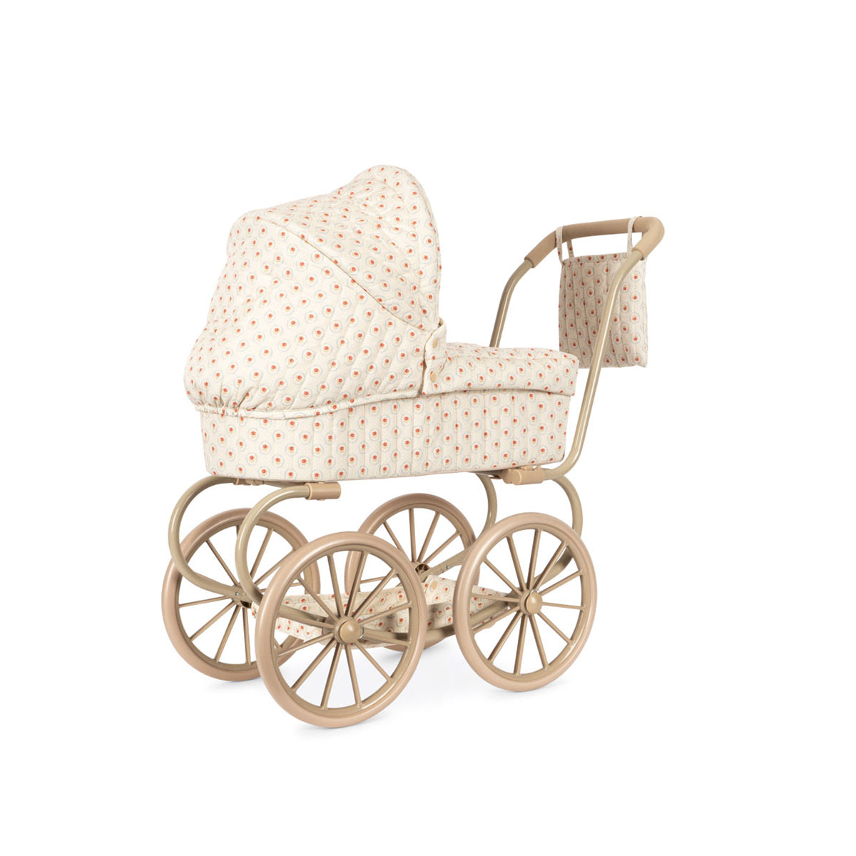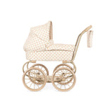 Kolica za lutke u vintage stilu u manjoj verziji, prilagođena manjoj deci. Dizajnirana sa četiri velika točka, mekim prošivenim pamučnim platnom, nežnim talasastim ivicama i dušekom. Kolica za lutke uključuju sklopivu nadstrešnicu za sunce i korpu za odlaganje. Ram je napravljen od metala sa sunđerastim mekim ručkama. Dolaze potpuno sklopljena i lako se odlažu.