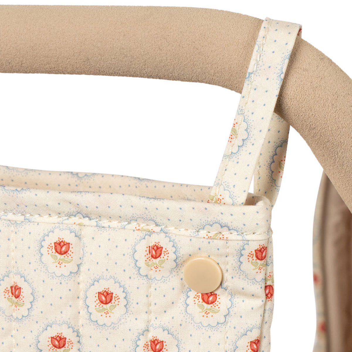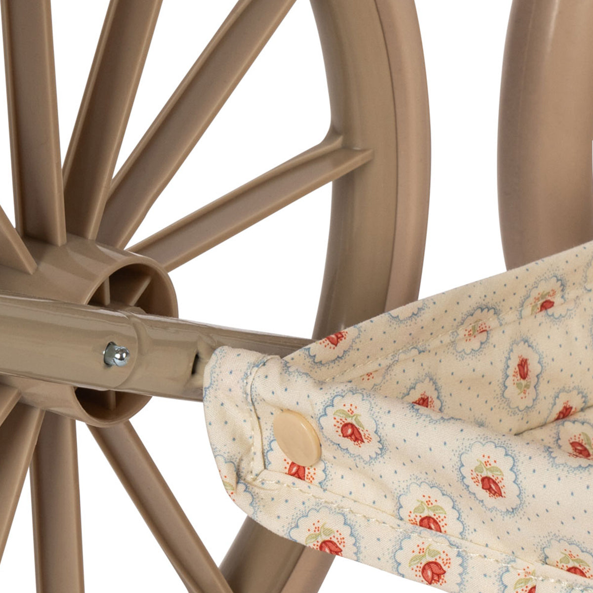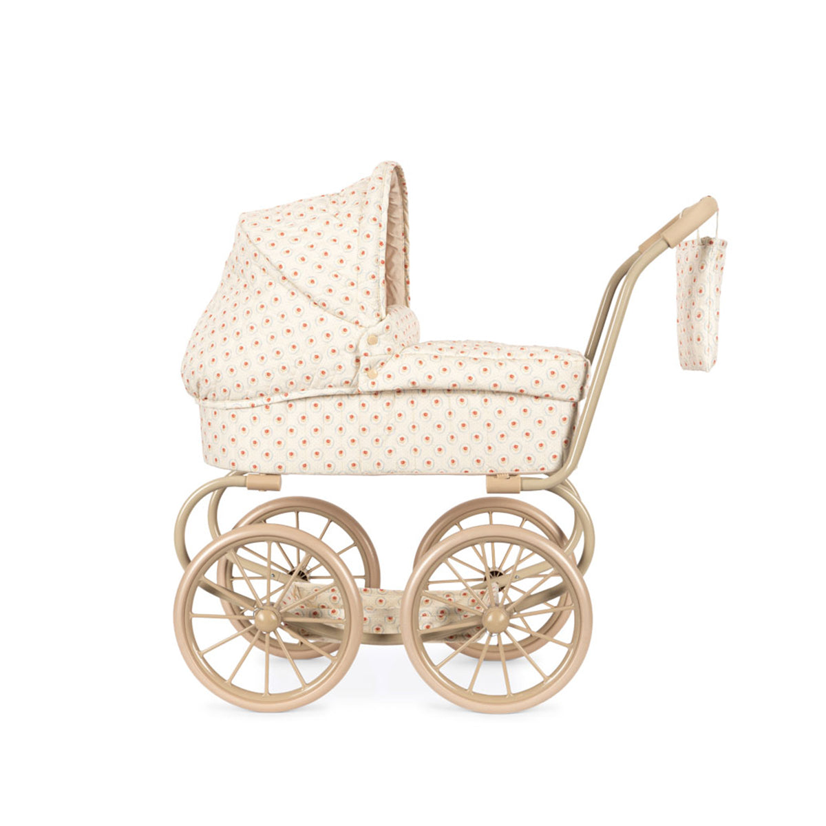 Kolica za lutke u vintage stilu u manjoj verziji, prilagođena manjoj deci. Dizajnirana sa četiri velika točka, mekim prošivenim pamučnim platnom, nežnim talasastim ivicama i dušekom. Kolica za lutke uključuju sklopivu nadstrešnicu za sunce i korpu za odlaganje. Ram je napravljen od metala sa sunđerastim mekim ručkama. Dolaze potpuno sklopljena i lako se odlažu.