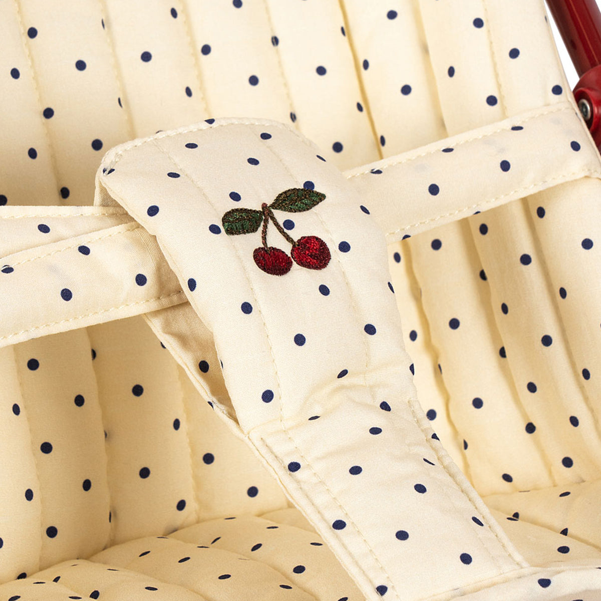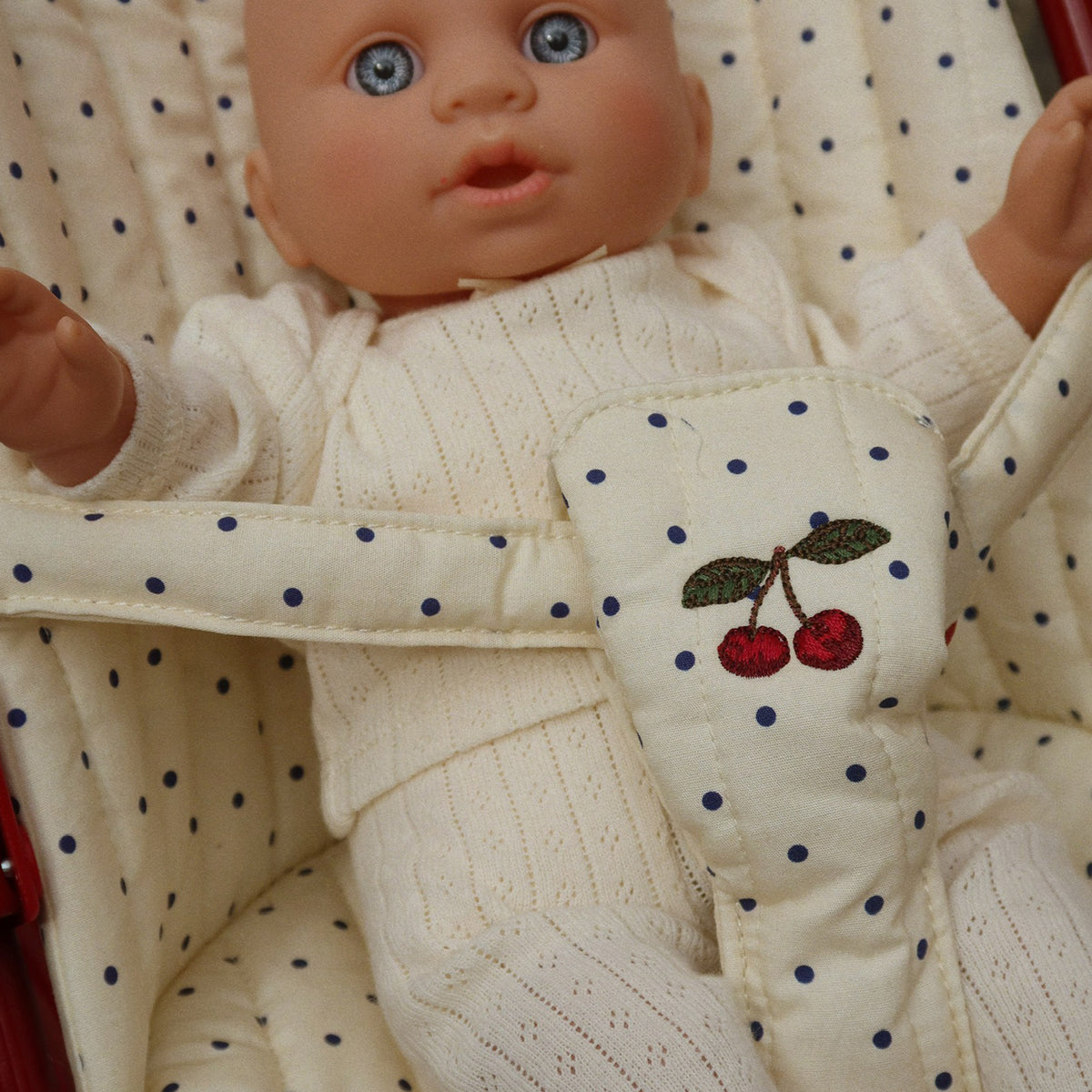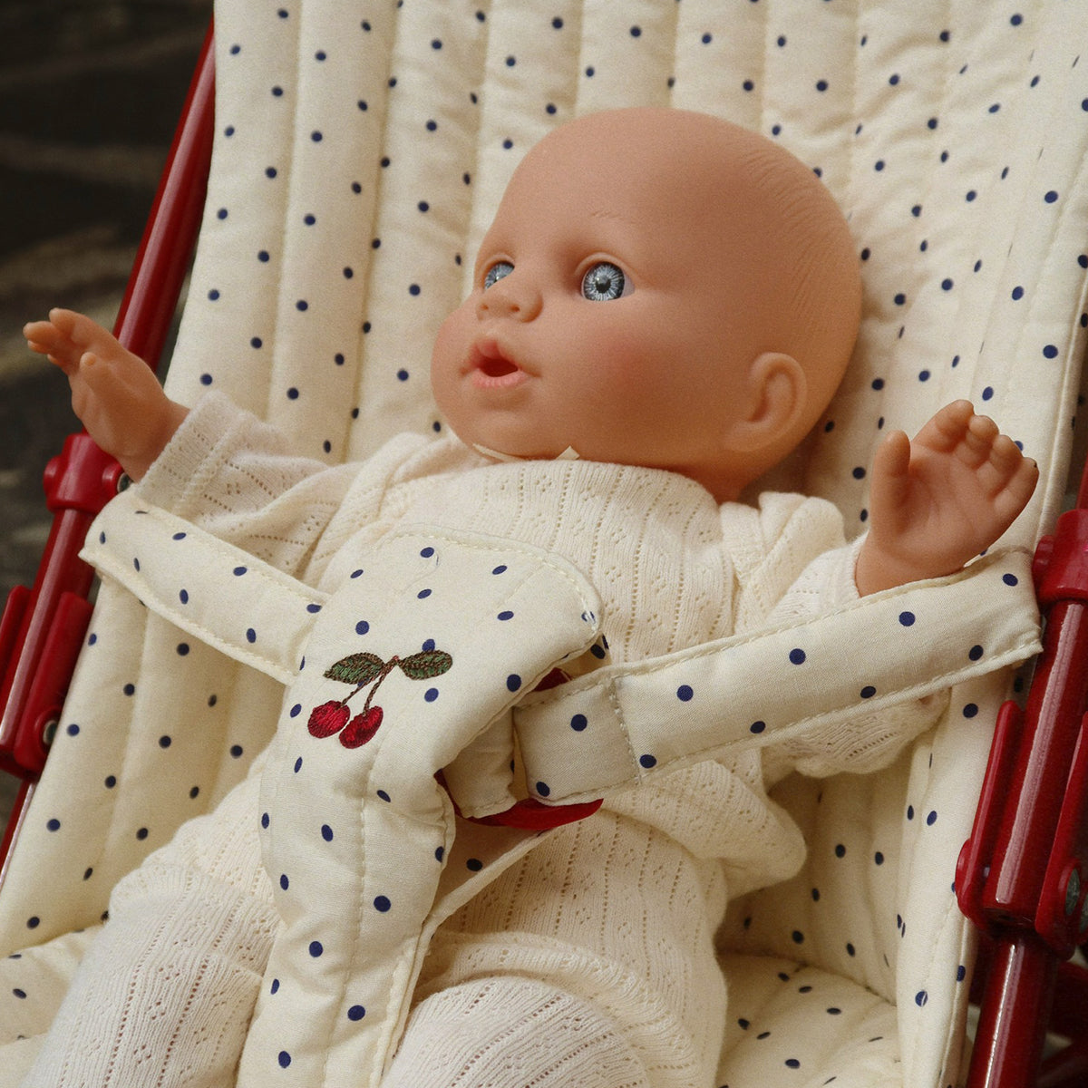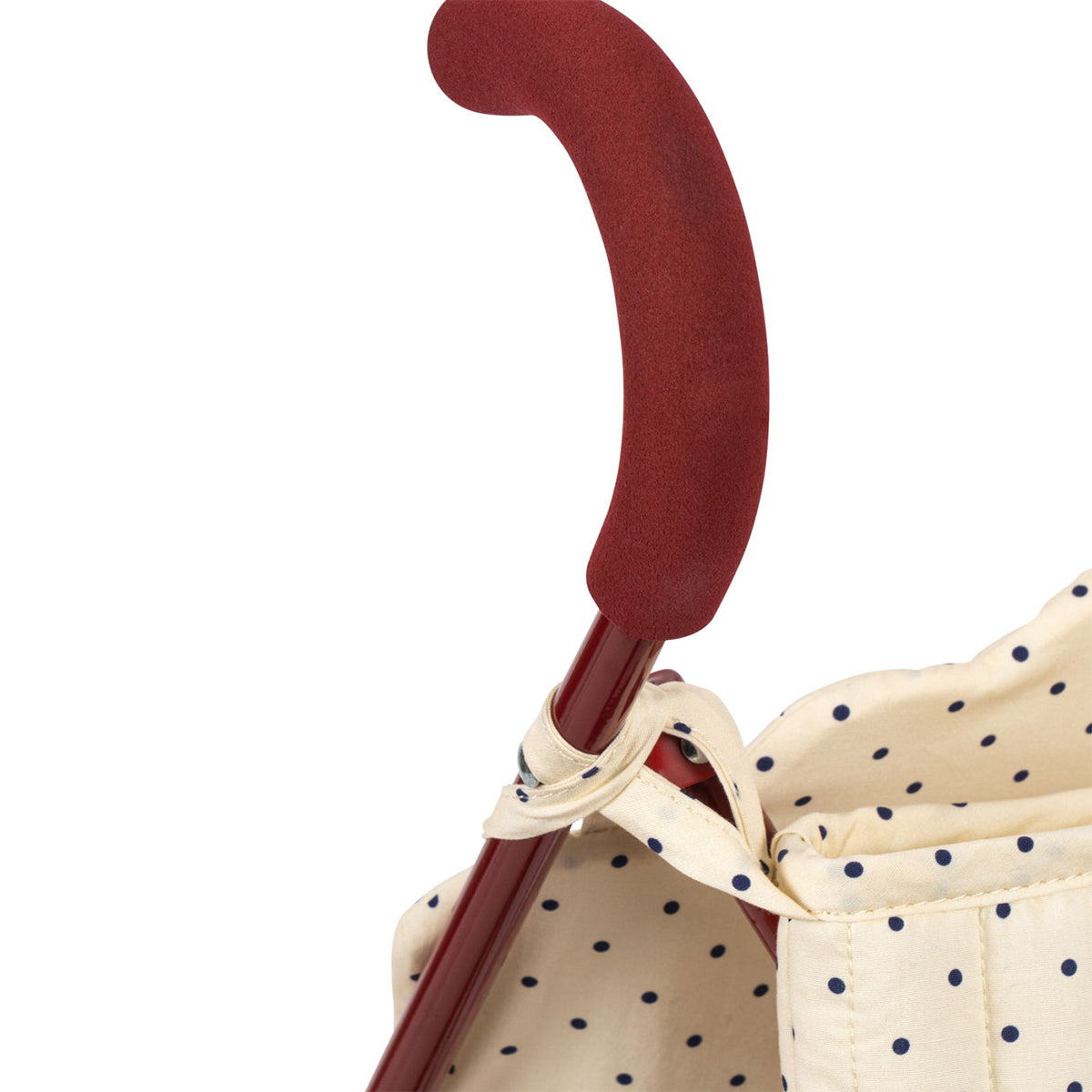 Kolica za lutke sa pojasom, torbom i četiri dupla točka za dodatnu stabilnost. Izrađena od organske pamučne tkanine koja se može ukloniti. Dolaze u potpunosti sastavljena. Lako se sklapaju i čuvaju. Okvir je napravljen od gvožđa sa mekim i sunđerastim EVA materijalom na ručkama.