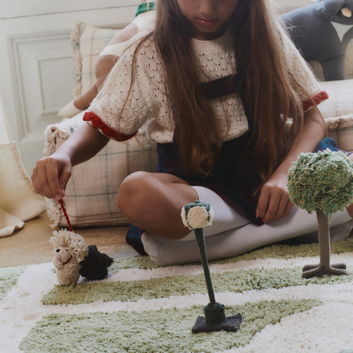 Uključuje pet ručno rađenih dodataka: drvo, uličnu lampu, most, psa i labuda — sve smešteno u praktičnoj pamučnoj torbi. Svaki komad je pažljivo izrađen ručno koristeći materijale poput pamučnih vrpci, bambusa i ručno obrađenih detalja kako bi park oživeo.